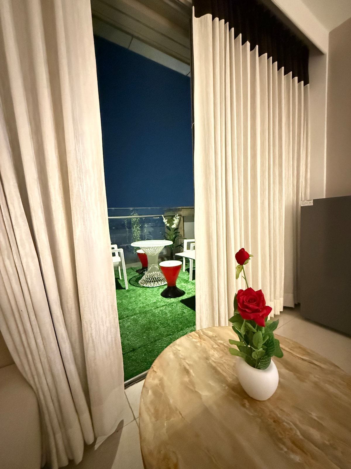 ➽ Spacious 1BHK apartment with an attached patio, fully air-conditioned. All rooms have 1.5-ton ACs. ➽ Sun-facing property in a high-income neighborhood, three-side open, park-facing, and well-ventilated with ample natural light and fresh air. ➽ High-end projector with 25W soundbar and Amazon FireStick with OTT apps. ➽ Fully equipped kitchen with essentials for convenient cooking. ➽ Relax on the stunning private terrace patio with ambient lights and unique Foger system for cooling the patio