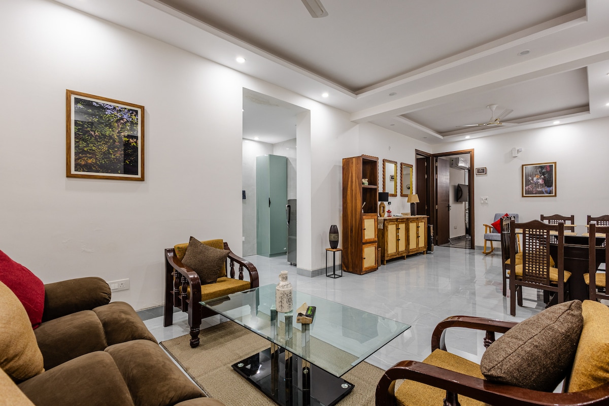 Attention: In peak season, place is booked very quickly! Experience unparalleled luxury in this exquisite South Delhi 3-bedroom floor in a house, in exclusive and gated Sainik Farms, located close to malls and Saket Metro Station. Bespoke Statuario Italian marble floors, hand-crafted furniture & spacious bedrooms with private balconies. Unwind in spa-like bathrooms with bathtubs, AI-based climate control, a fully equipped modular kitchen, and serene outdoor space.