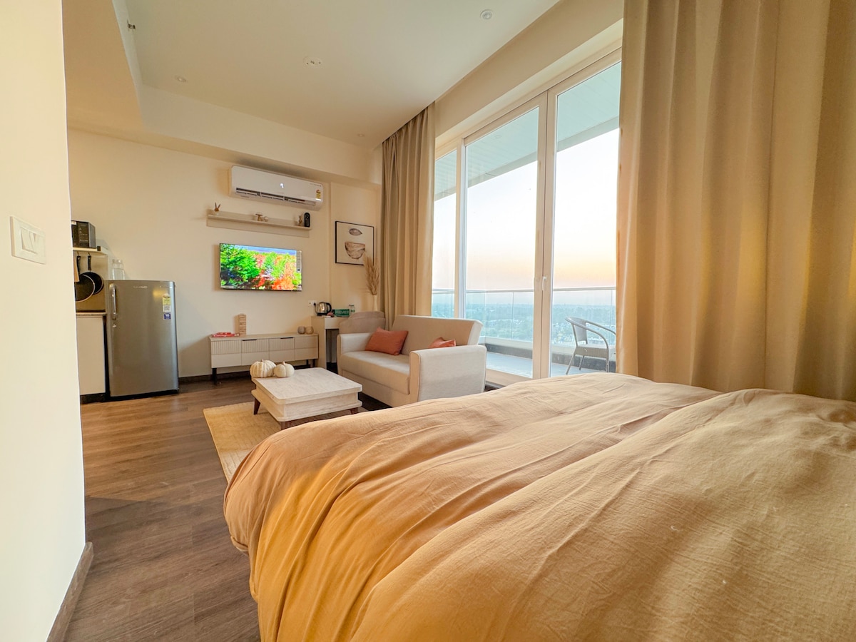 Stylish City Pad in Gurgaon's Heart! Escape to this beautifully designed apartment in Sector 49, blending urban charm with total comfort. Enjoy a cosy king-size bed, a full kitchen, a sleek bathroom, a workspace with Wi-Fi & a private balcony offering city views. ✦ Prime Location ✔ 20 mins from the IGI Airport & near DLF Cyber Hub, malls & cafes. ✦ Self Check-in & Hassle-Free Parking ✦ Roof Top Swimming Pool (IN4 499/+ Taxes per person) ✦ Ideal for romantic escapes, solo, or corporate trips.