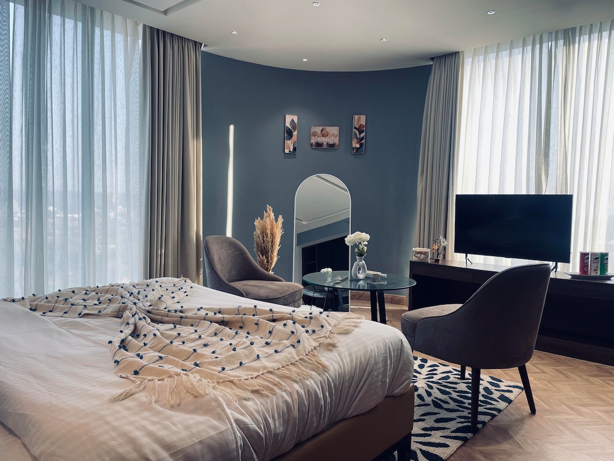 Welcome to our amazing suite which is situated on 15th floor of a high rise building. This 2bhk is completely fresh apartment. Wide private patio with city skyline view makes it unique in class. The place is perfect for relaxing and enjoying scenic view of modern architecture. Apartment is loaded with 3 smart tvs (all applications works), 2 cozy double bed, 2 big wardrobe with locker, 6 seater sofa, stylish coffee table,iron board, fridge,microwave,induction,electric kettle, toaster & much more