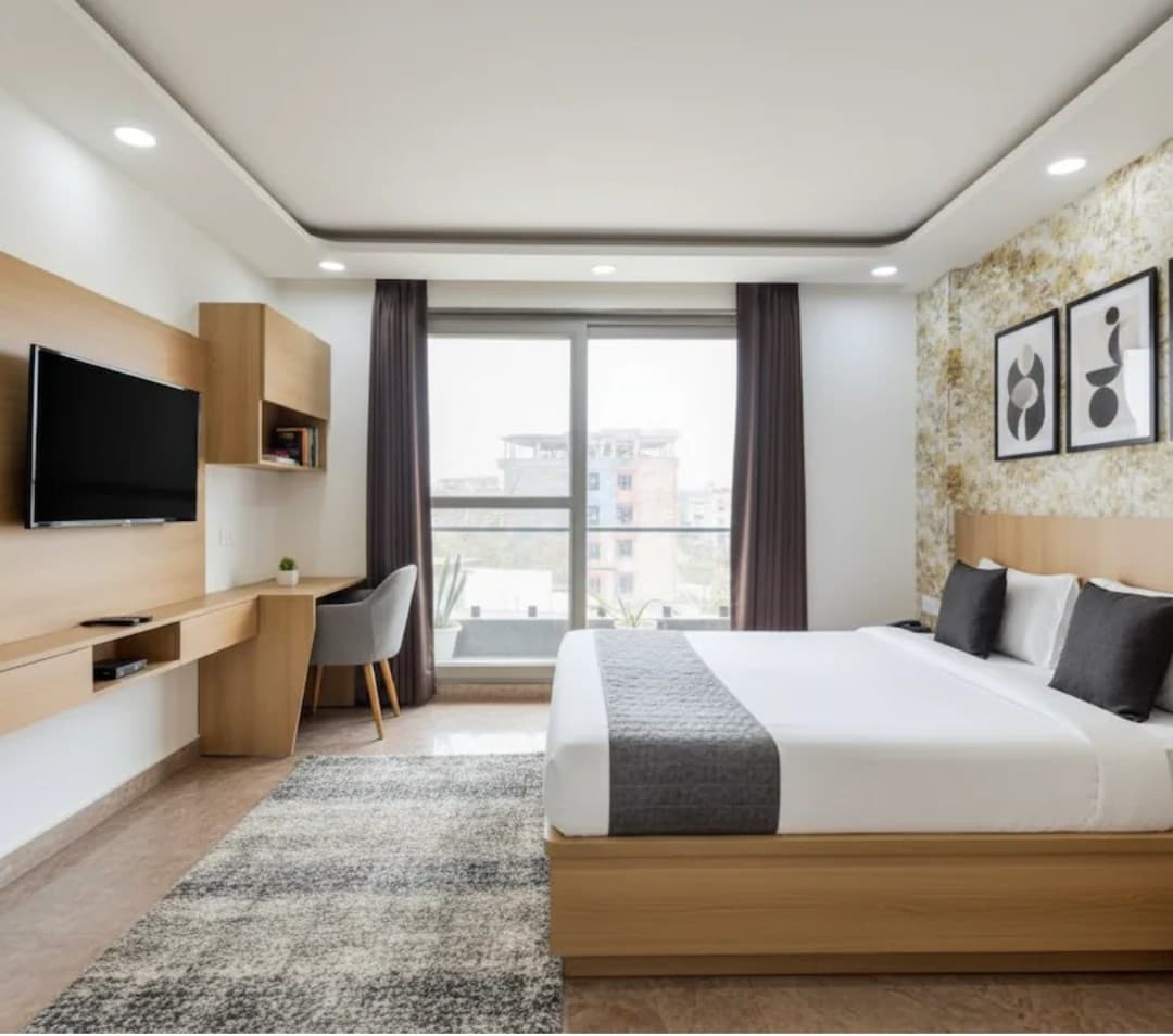 Managed by Perch Service Apartments. Top rated hospitality has helped us win the hearts of our guests and several awards since 2011 • Medium size Studio Apartment w balcony • Fully equipped Kitchen (Cooking Hob, Utensils, Cutlery, Refrigerator, Microwave etc) • Central Kitchen , Room ordering & Breakfast Lounge • Breakfast available at Rs 295 +GST per person. • Gym & guest lounge w large smart Tv • 5 min walk to Ambiance Mall & DLF Cyber City • 500 mts to Moulsari Ave Metro Station