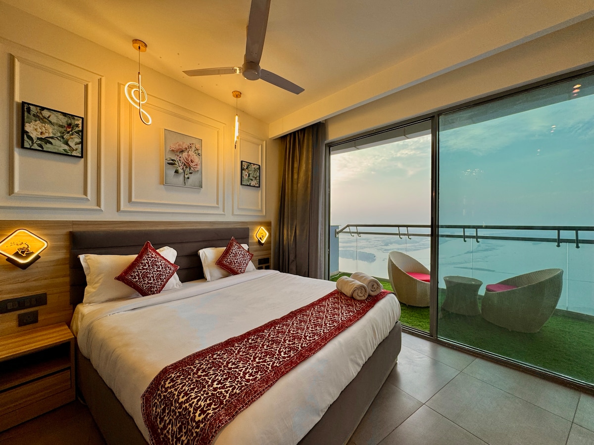 Our luxurious comfortable, Aesthetically designed suite with terrace overlooking lush biodiversity park , just 20 min from the Airport, is a perfect choice for couples for a relaxed quiet private luxury stay. 55 inch smart TV, JBL 9 Sound bar, mood sparking lighting. luxury bath, private landscaped terrace, bar, private dining, latex mattresses and huge mirror on the headboard makes it look extremely sensual. Proximity to great Restaurants, popular Bars, Cafe and Spas within 10-15 min walk.