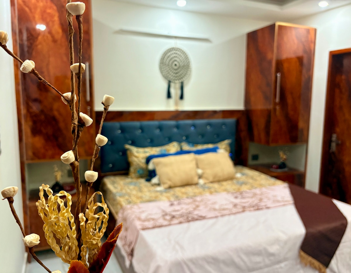 Welcome to your cozy private room in Mahavir Enclave, perfect for solo travellers, working professionals, or two guests such as married couples, siblings, or cousins. (Please note: we do not host unmarried couples.) This room is a family home but offers complete privacy, with your own: ✔ Queen bed with fresh linen ✔ Private attached bathroom ✔ Private balcony ✔ High-speed Wi-Fi ✔ Lift access ✔ Free parking for Hatchback car & bikes ✔ CCTV security in outside areas ✔ Smart TV ❌No Kitchen