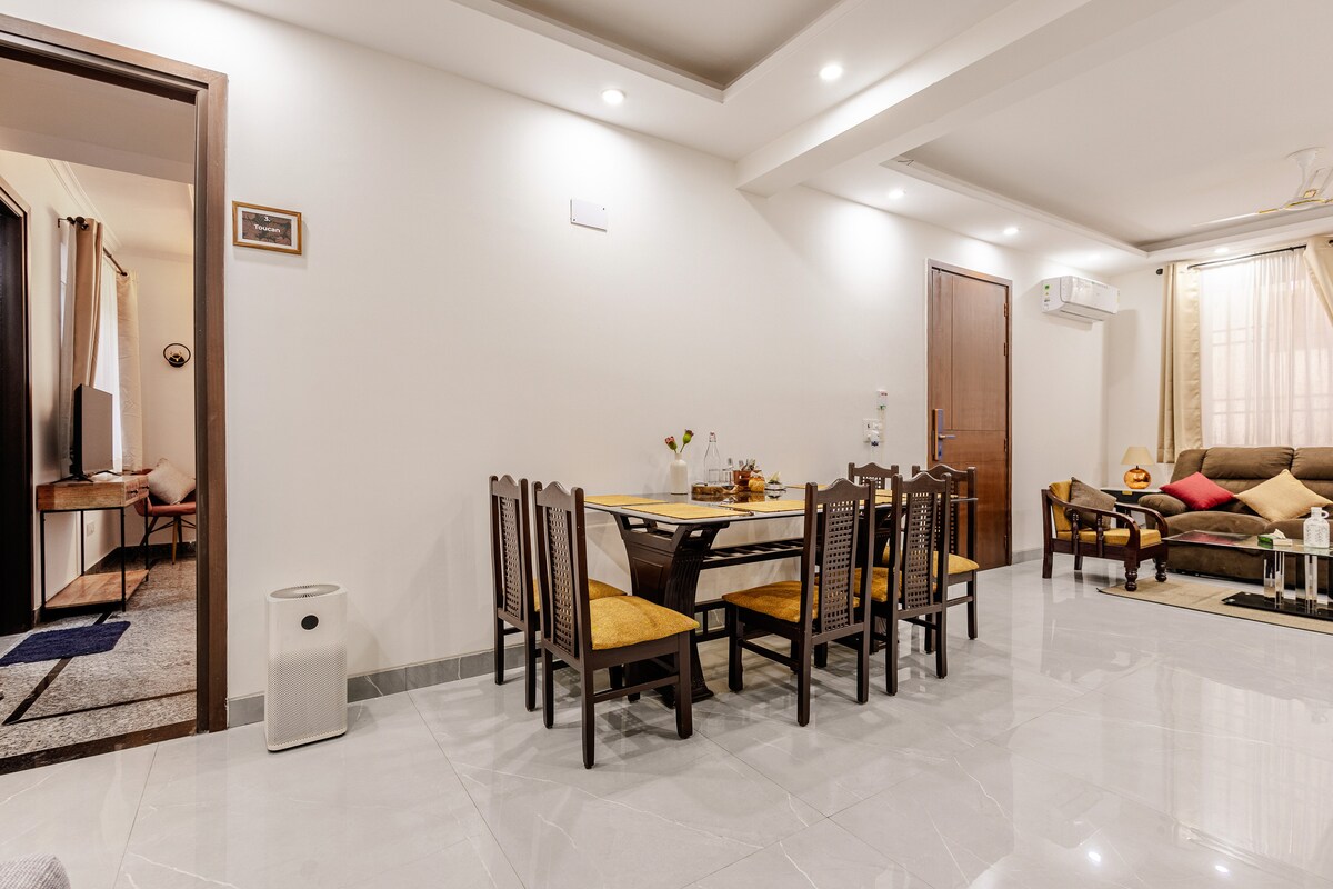 Attention: In peak season, place is booked very quickly! Experience unparalleled luxury in this exquisite South Delhi 3-bedroom floor in a house, in exclusive and gated Sainik Farms, located close to malls and Saket Metro Station. Bespoke Statuario Italian marble floors, hand-crafted furniture & spacious bedrooms with private balconies. Unwind in spa-like bathrooms with bathtubs, AI-based climate control, a fully equipped modular kitchen, and serene outdoor space.