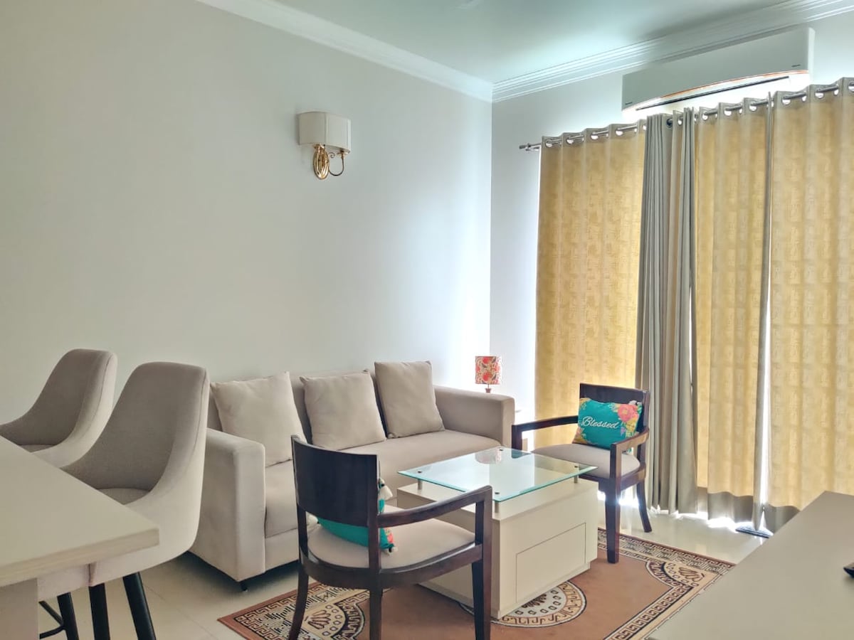BLUO STAYS - Award-winning Home! Super Location - spacious Designer Apartment (620 sq ft) opposite famous DLF Galleria Market with Cross Point Mall & City Club on left side. It has King Bed, Bathroom, Work Desk, separate Living Room with Couch & Dining Table, private patio garden seating & full Kitchen with gas stove, Fridge, Microwave, cutlery-crockery, etc. All-inclusive Daily Rental - WiFi Internet, Netflix/TataSky, Cleaning, Washing Machine, Utilities, Parking, Power Backup, Gym, TT..