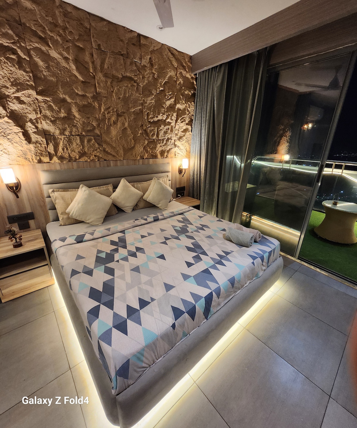 Perched on the 43rd floor, this stone-themed apartment is a refined blend of nature-inspired design and contemporary luxury. The bedroom features a striking textured stone accent wall, softly illuminated to create a warm, resort-like ambiance, complemented by plush furnishings and elegant neutral tones frame a breathtaking panoramic view of Noida’s skyline, where city lights meet the serene flow of the Yamuna River. Thoughtfully designed lighting, clean modern lines, and a calm earthy palette .