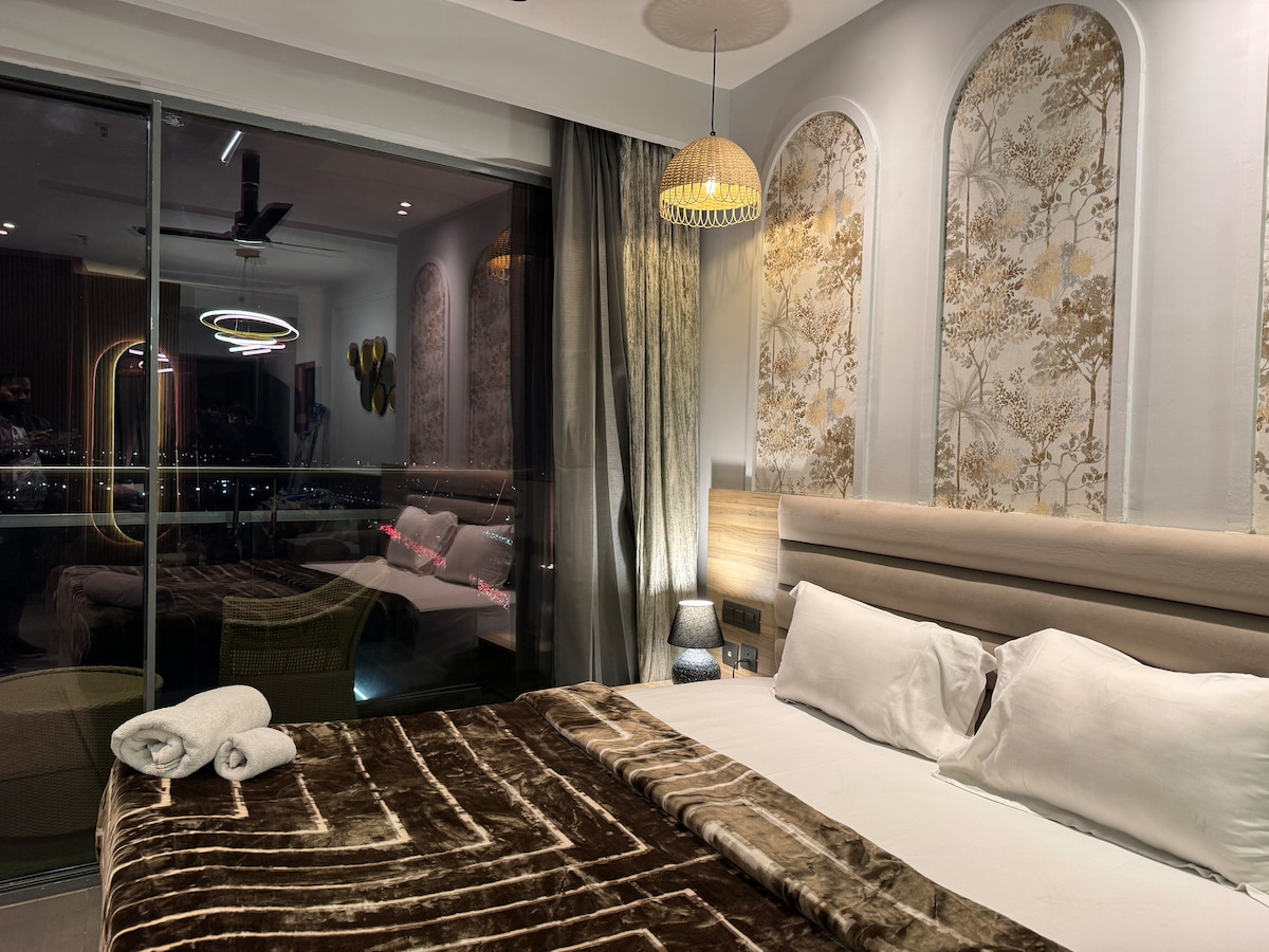 Luxury apartment Noida | River view room | Private serviced apartment | High-rise luxury stay | Balcony room Noida | Business stay Noida Private luxury studio apartment Located on 31st floor River view & city skyline views Private balcony with seating King-size bed with premium bedding Stylish sofa seating area Dedicated work desk & Smart TV High-speed Wi-Fi Functional kitchenette Modern bathroom with LED mirror Air-conditioned, well-lit interiors Ideal for business & leisure stays