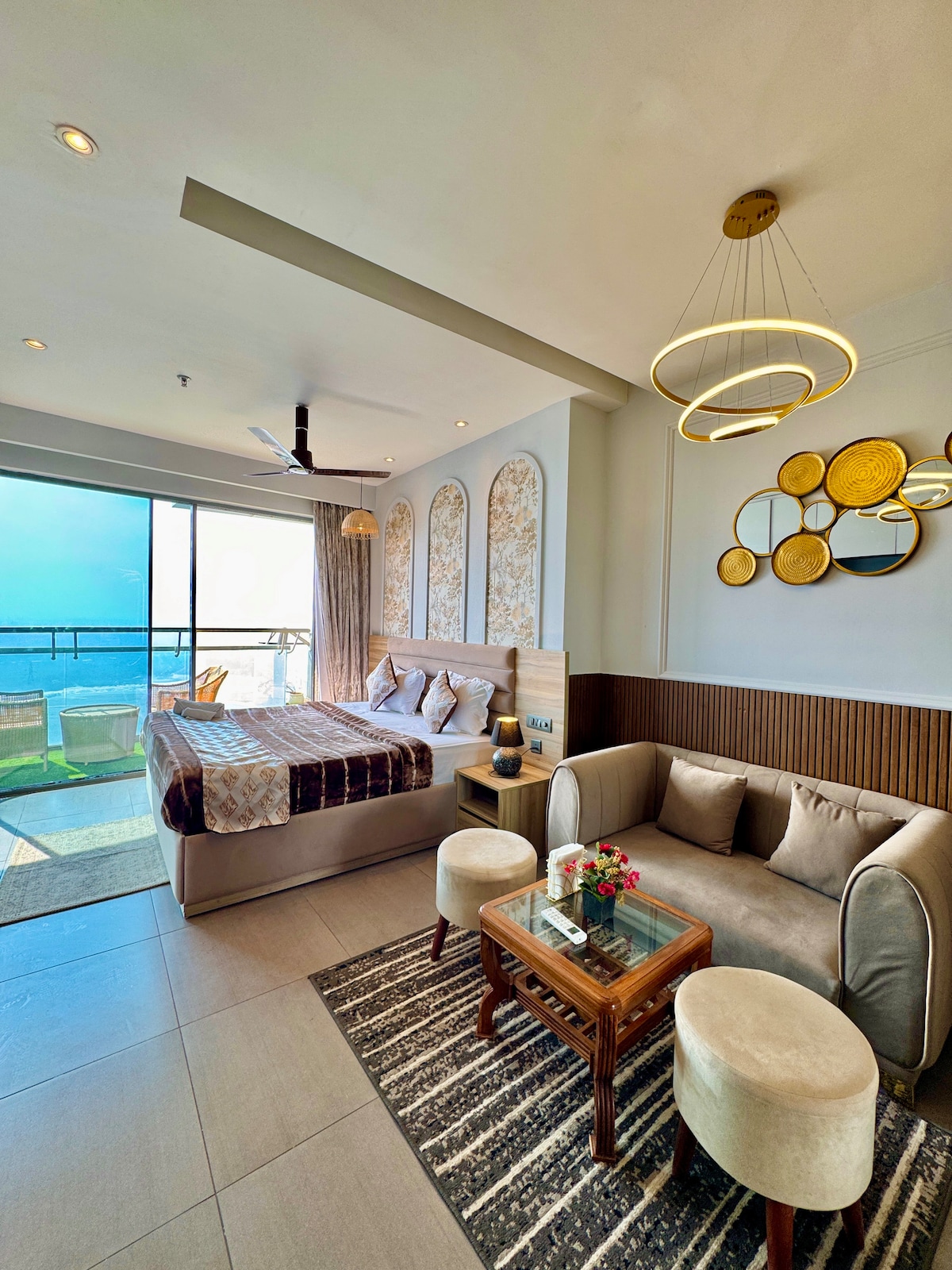 Luxury apartment Noida | River view room | Private serviced apartment | High-rise luxury stay | Balcony room Noida | Business stay Noida Private luxury studio apartment Located on 31st floor River view & city skyline views Private balcony with seating King-size bed with premium bedding Stylish sofa seating area Dedicated work desk & Smart TV High-speed Wi-Fi Functional kitchenette Modern bathroom with LED mirror Air-conditioned, well-lit interiors Ideal for business & leisure stays