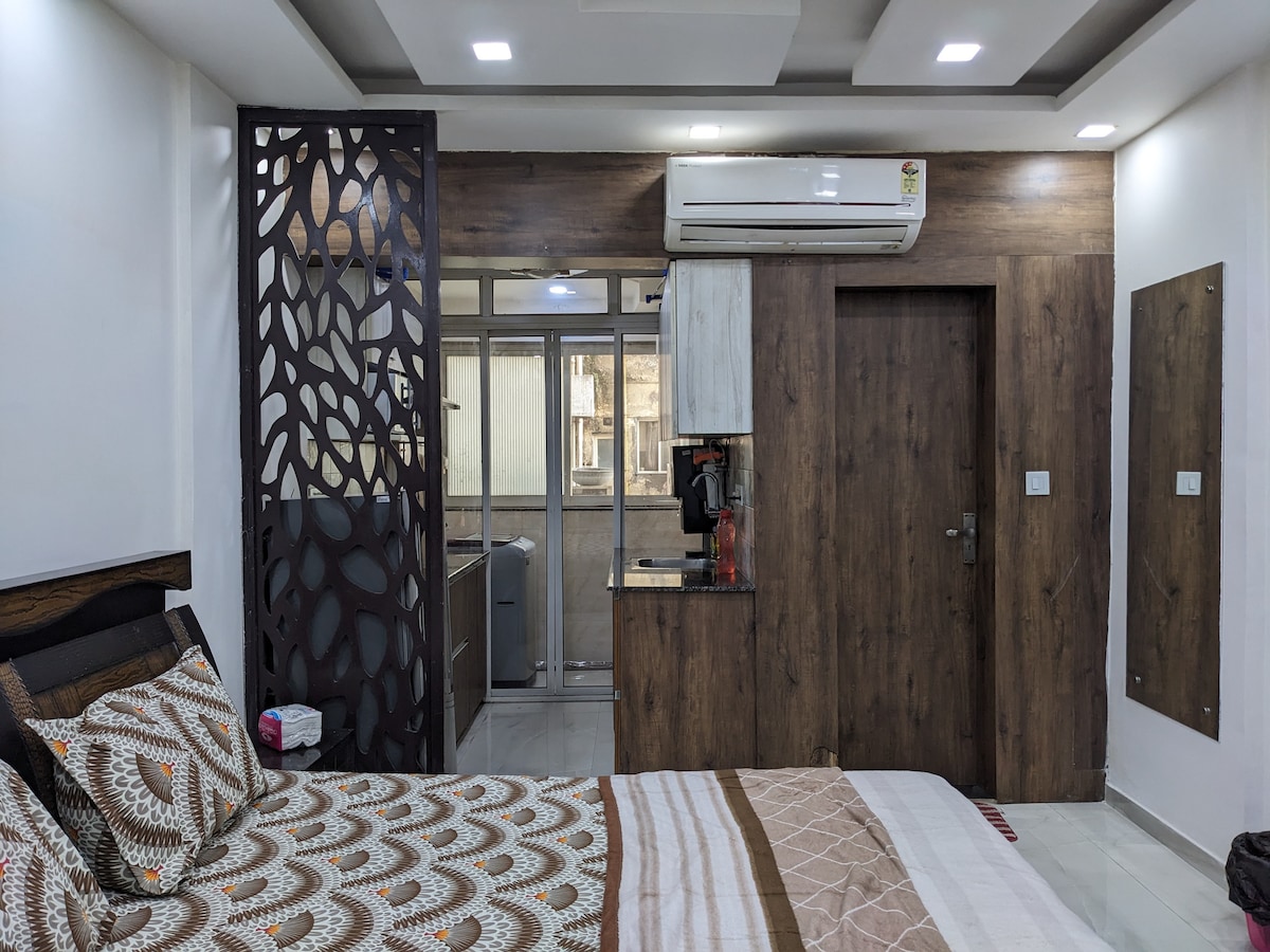 BLUO STAYS - Award winning Sanitized Homes! Private Studio (450 sq ft) in Green Park across Main Market, walking distance from Hauz Khas Village & Green Park Metro Station! It has large bay window for sunlight, King Bed, Bathroom, Work Desk, Couch, Dining & Full Kitchen with Stovetop Gas, Refrigerator, Microwave, Cookware etc. All-inclusive Daily Tariff - high speed WiFi Internet, TataSky TV, Cleaning, Washing Machine, Utilities, Parking, Power Backup..