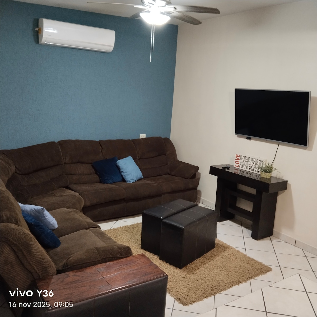 Disfruta una estancia tranquila en este lindo alojamiento con cochera privada y entrada autónoma con chapa electrónica, ideal para viajes en familia, con amigos o por trabajo. Cuenta con dos recámaras:1 cama, queen y 2 camas individuales. Todas con mini split frío/calor. Podrás relajarte viendo tus series en la Smart TV, disfrutar del WiFi y cocina totalmente equipada. Además, tienes lavadora/secadora. La ubicación es práctica y segura, con todo lo que necesitas para sentirte como en casa.