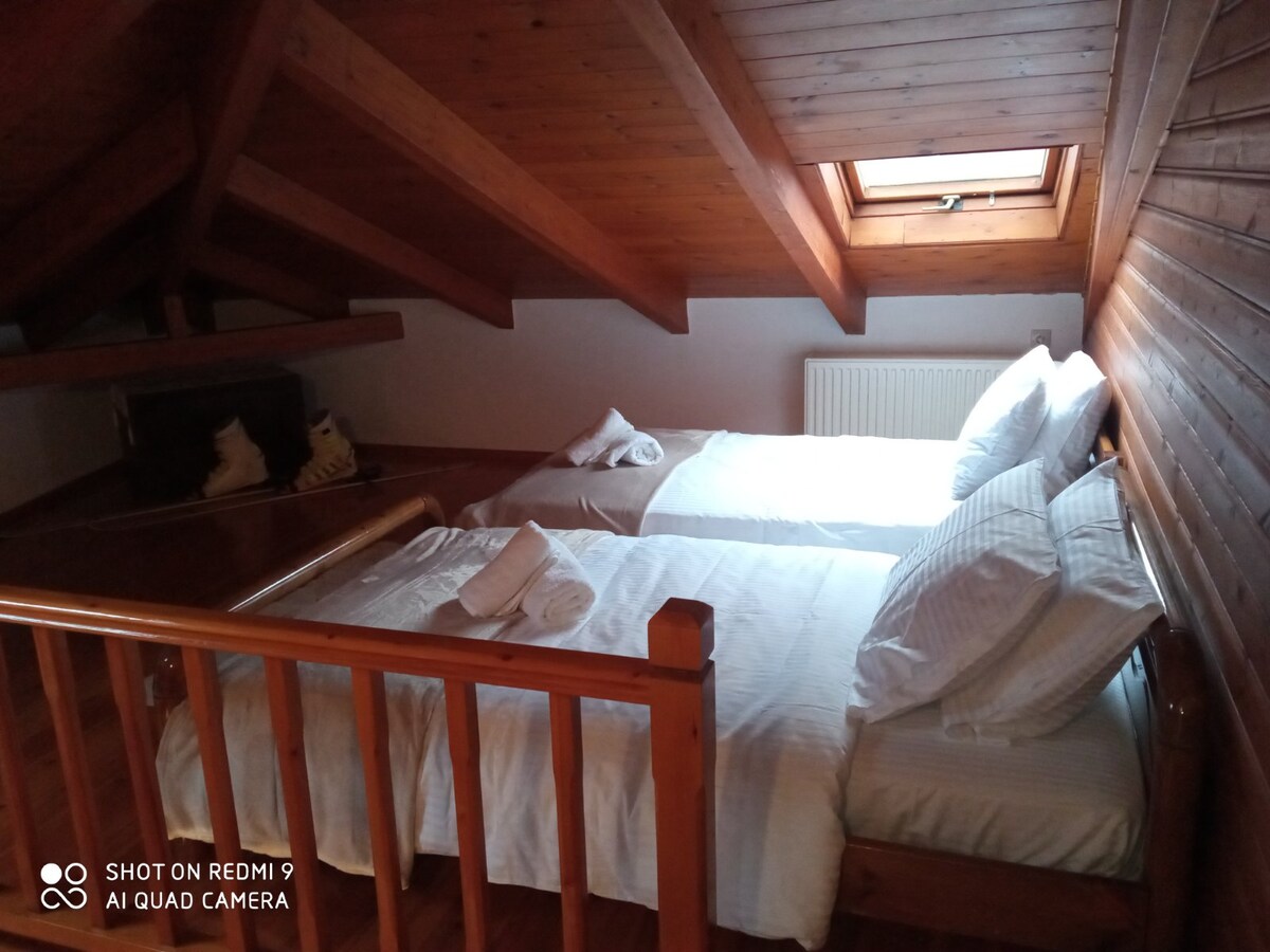 2-floor cosy apartment 102m² within the “Holidea” Residence complex, 5' walk from Arachova centre!🤩 ● It can accommodate 8 guests in 4 separate bedrooms with 4 en-suite bathrooms. ● 1 extra guest can also sleep on the living-room couch in the ground floor. ● Spacious living-room with fireplace, dining room with fully-equipped kitchen. ● Breathtaking balcony views of the village, the valley and the opposite mountain range.😍 ● 3 Parking spaces provided with direct access from inside the flat!