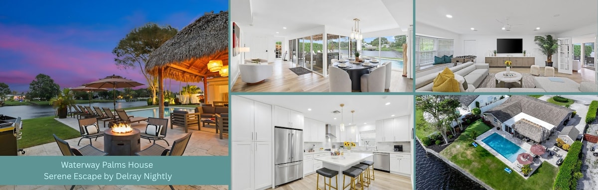 DELRAY NIGHTLY presents Waterway Palms, a 3BR/3BA waterfront Delray Beach vacation rental with heated pool, Tiki Hut, firepit, putting green, and outdoor games. Sleeps 8 with king beds, smart TVs, high-speed Wi-Fi, and chef’s kitchen. Enjoy a welcome basket, starter supplies, spacious open living areas, and resort-style outdoor fun. Just 10 minutes from Atlantic Avenue, beaches, dining, nightlife, golf, and upscale shopping. Book your luxury Florida getaway today!
