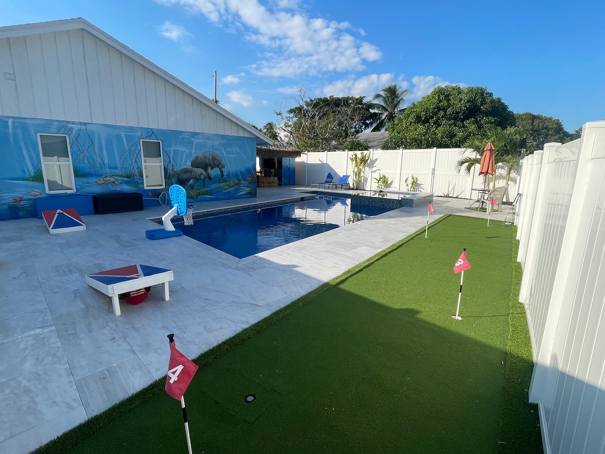 Fully renovated 3 bedroom lake front home in a peaceful neighborhood in West Boca Raton. Luxurious backyard fun for all ages! Large outdoor living area under tiki hut, private golf putting green, mess free turf and clean concrete patio perfect for fishing, sunbathing and cooking. Fully equipped kitchen , full size arcade games, ps5, 60” smart tvs in every room and outside! Message us directly for monthly+ stays/additional questions.