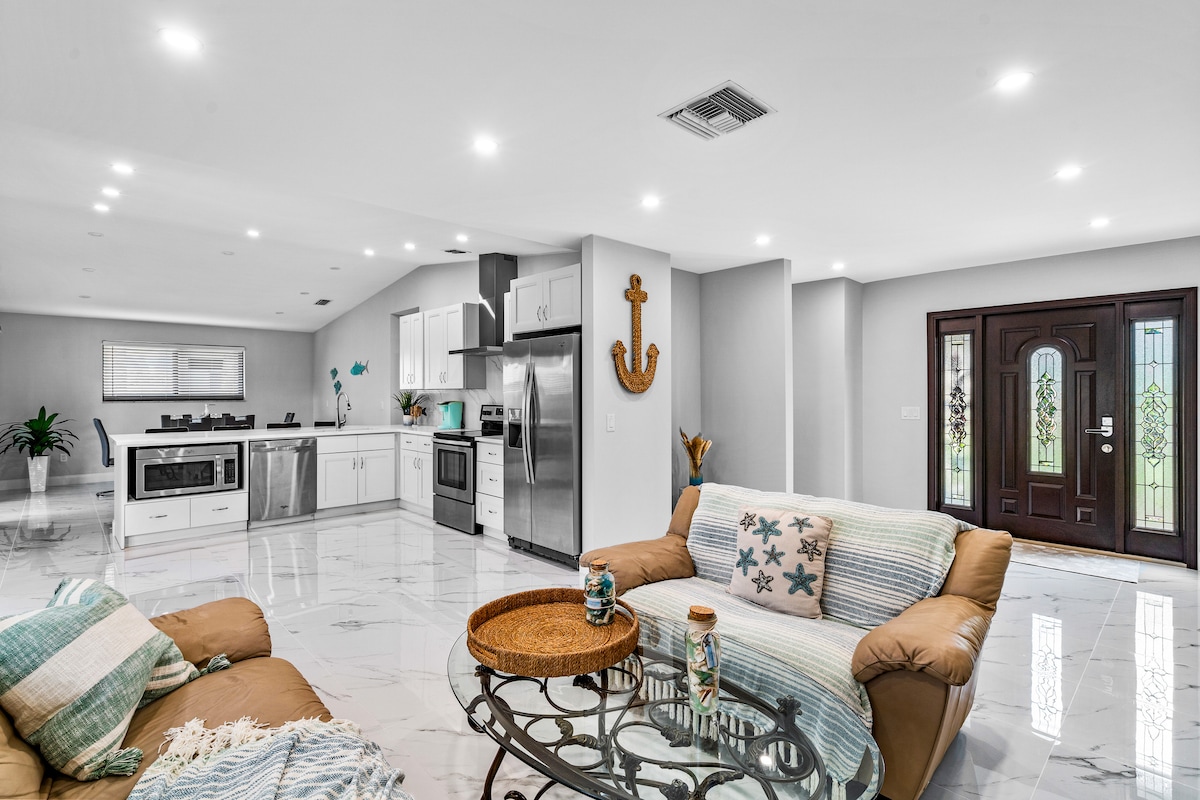 Bold interior design in this newly renovated pad with a beautiful canal and dock in delray. Step in the front door and immediately you see the large windows looking out onto the water in the back. This is true to Delray Beach with all its charm. Now pop on a movie on the big 75 inch Smart TV screen, rest your head on the comfy beds, shower under the rainfall fixtures and truly unwind in a Delray-geous getaway. Just 6 minutes to the beach or Delray's amazing nightlife and restaurants.