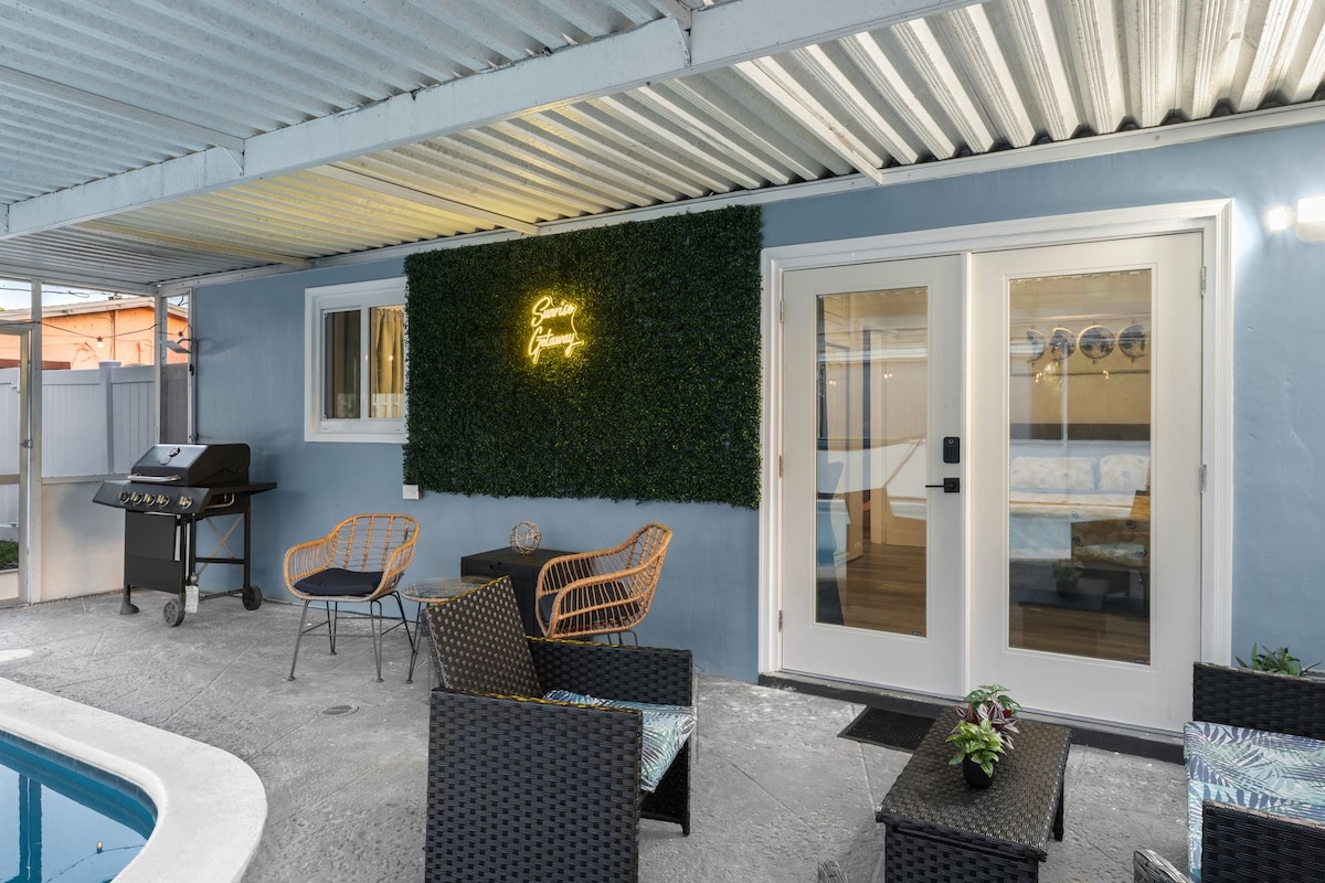 This amazing mini resort has been created with the ultimate comfort of our guests in mind. Enjoy a courtyard and pool deck designed with plenty of outdoor seating and a tiki hut. The property has synthetic grass through out, perfect for kids and family to sit and play on. Super fast Wifi. USB ports in the bedroom. Super comfortable bed. Smart Tv that you can Stream your favorite movies to. Washer/Dryer combo. Outdoor BBQ. Our home is located Minutes from downtown and Hollywood beach/ boardwalk.