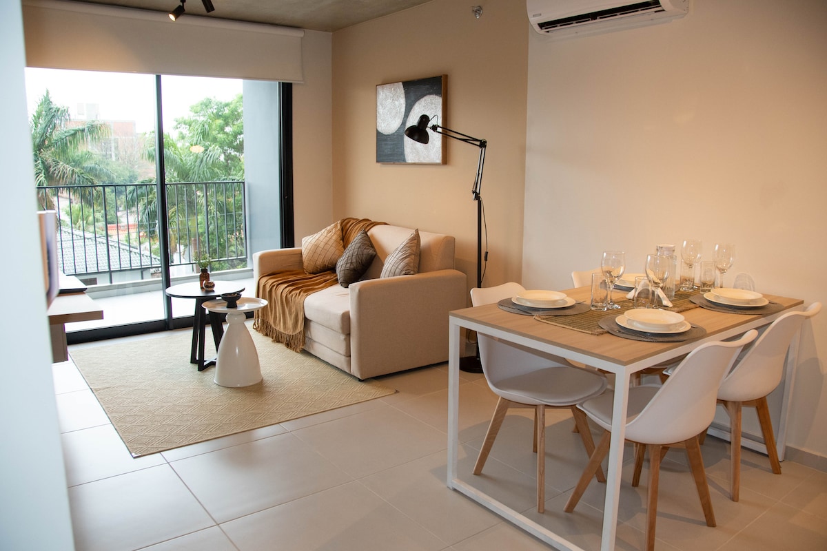 Hermoso y acogedor departamento en un edificio residencial, situado en un barrio muy concurrido con grandes centros comerciales y variedad de restaurantes. Ideal para moverse caminando. Relájate y disfruta de una hermosa piscina en la terraza del edificio, y de un completo gimnasio. El departamento está completamente equipado para 4 personas, tanto para estadías largas como cortas. Tiene 2 habitaciones, un baño completo y un baño social, cocina completa, living comedor, y balcón. Enjoy!