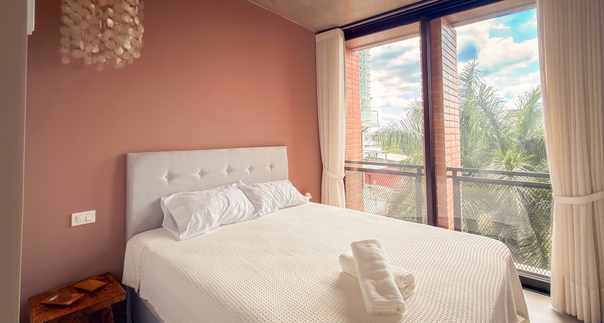 Modern studio apartment in one of the best areas. Half a block from Shopping del Sol, 3 minutes from Paseo La Galería, and 12 minutes from the airport. Easy access to restaurants/supermarkets/offices. Has a Queen bed, Smart TV, air conditioning, WiFi, a fully equipped kitchen, and a private balcony. Access to common areas such as a coworking space, laundry room, pool, gym, sauna, and spa. Parking is not included, but can be rented within the building for USD $10 per day, subject to availability.