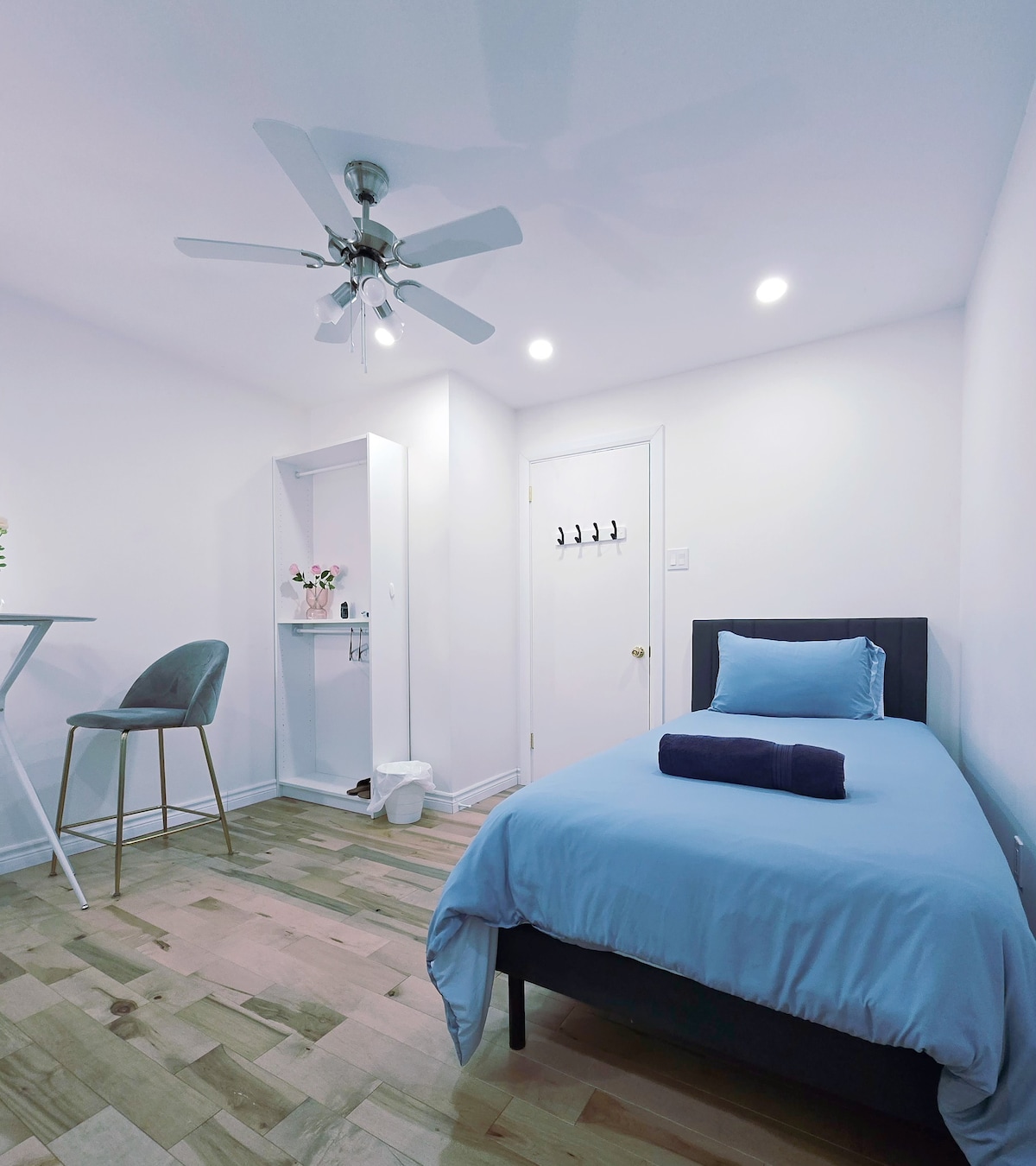 Small studio (6 by 22 feet) (it is not basement) (ONLY FOR NO SMOKER) with private bathroom, private kitchen, private entrance and private parking in a single-family house. It is equipped with a wall-mounted heat pump, induction cooktop, small oven, microwave, refrigerator, underfloor heating, humidity detector, oil heater, Smart TV (Bell TV). The bed is not double, it is queen. Washer and dryer are shared. Several shops within walking distance.