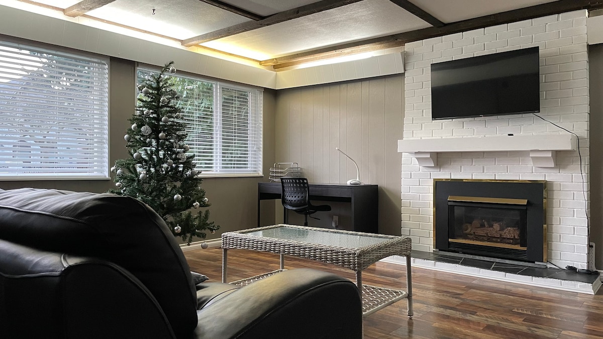 A newly renovated basement suite offers full kitchen, spacious dining and living room area, relaxing Queen bed and a retro-modern designed bathroom! Enjoy free wi-fi and watch your favourite Netflix movies in a huge TV with a warm electric fireplace. Morning coffee and bottles of water are complimentary! Located in a quiet but friendly neighbourhood where you can walk on trails, near bus-stops and only 20 minutes drive from/to Tsawwassen Ferry terminal. 30 minutes drive from/to the YVR airport.