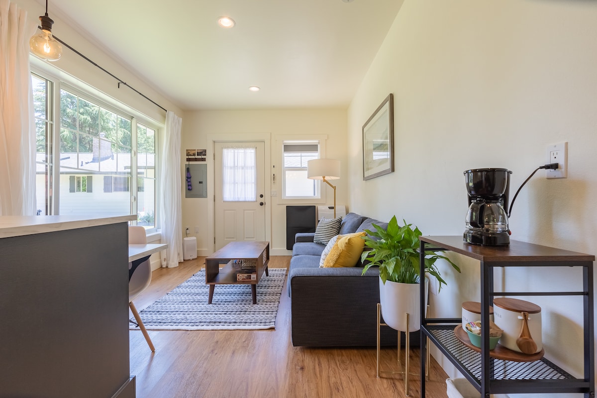 Escape to a peaceful tiny home retreat with a wood-fired sauna, conveniently located 10 miles from both Bellingham and the Canadian border. This calm, stylish tiny house is ideal for couples or solo travelers seeking a quiet Pacific Northwest getaway. Thoughtfully designed and well-stocked, it has everything you need to make breakfast or a simple dinner. Guests also enjoy access to the on-site wood-fired sauna, perfect for unwinding after a day of exploring or enjoying a slow, cozy evening.