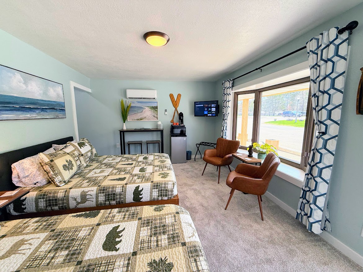 Welcome to Unit #3, a warm retreat in our newly restored roadside motel, Peninsula Point Lodge. Designed with a log-cabin charm on the outside & modern comfort within. Situated at the edge of the Hiawatha National Forest. Brand-new king mattress, a newly renovated bathroom, heat & A/C, WiFi, Smart TV for easy streaming. Whether you’re relaxing after a day of adventure or seeking a peaceful forest escape, Unit #3 offers the perfect blend of rustic ambiance and modern convenience.