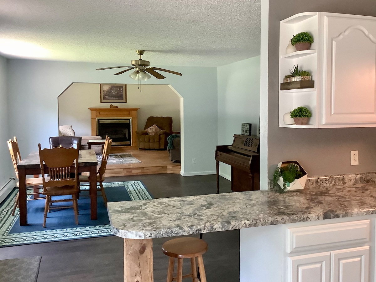 The Highbanks is a 3 Bedroom 1.5 bath home that can sleep and feed up to 6 people. Full breakfast is included! Serve yourself: Items included, but not limited to; Coffee (decaf/reg),hot cocoa (kureig+ traditional pot), several kinds of cereal, waffles, pancakes, milk, juice, eggs, sausage, bread + more! The Home has HEPA filter, and UV light air filtration, and laundry facilities on site with soap and detergent. There's large driveway with plenty of parking for trucks+boats/trailers/RV's etc.