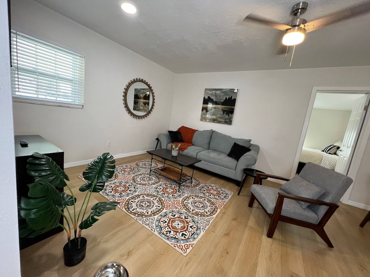 Make memories with the ones you loves at this unique Countryside loft feeling cottage with an elegant mix between rustic and modern aesthetic. We are a pet friendly Cottage, bring your furry friend and enjoy the coziness. This is a family wood gated compound. Each cottage are private, surrounded by beautiful común areas. Surrounded by a lot of natural springs and also the convenients of local restaurants like “Gators Joes Beach Bar & Grill” at just 6m walk, 6m walk to Lake Weir, and more.