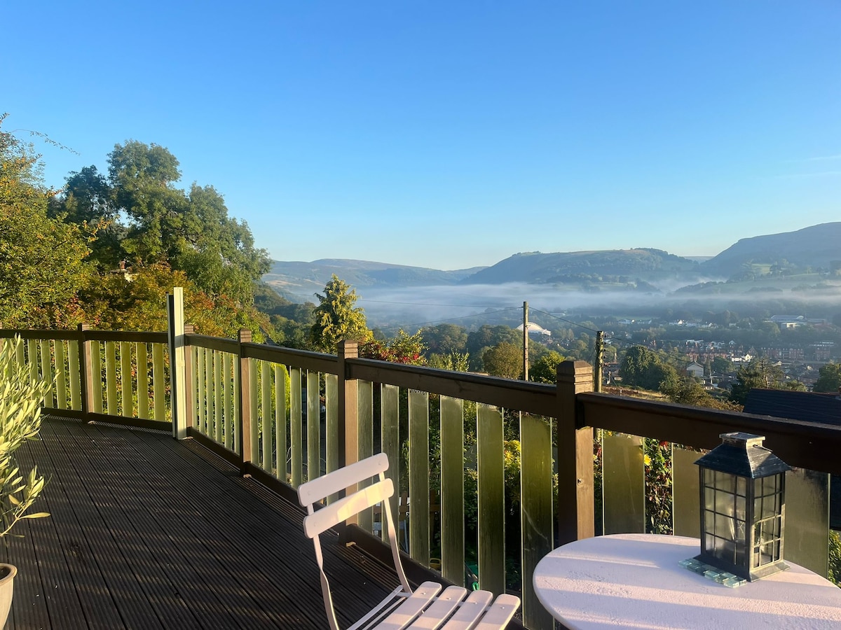 Take it easy at this unique and tranquil getaway. Set in a cottage garden on a hillside above the town of Llangollen our lovely blue cabin has panoramic views across town towards Castell Dinas Bran and the Horseshoe Pass. Beautiful Llangollen is great for a break any time of year. Sit with a drink on the decking, or in front of the little log burner, and watch the sunset over the mountains, or the snow sweeping in along the valley. Take a glass of sparkly and have a bath under the stars.