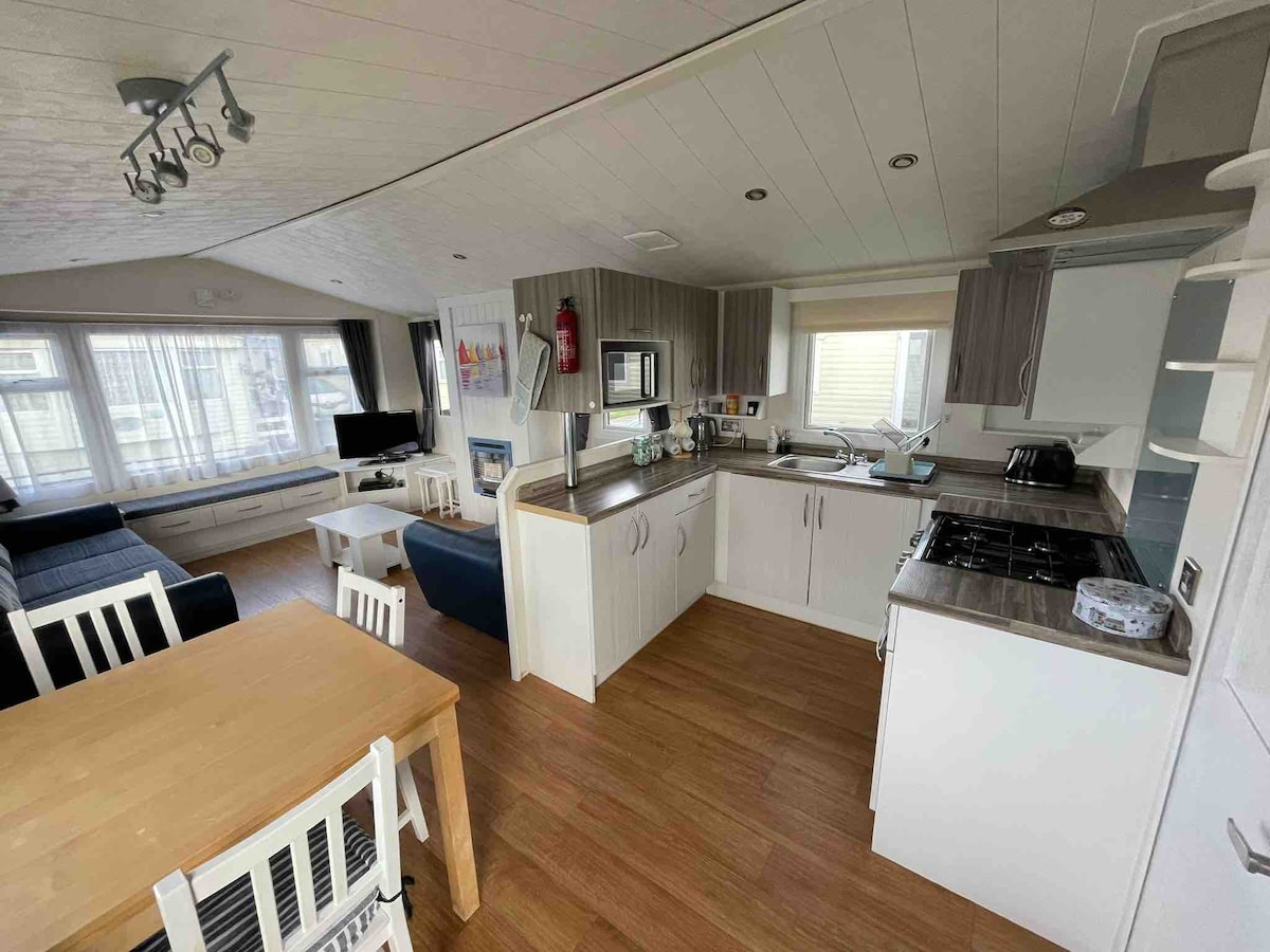 This end terrace cottage has a quirky style of its own. It has full central heating. Lounge is a good size with sofa and a matching arm chair, dining table, electric fire (log burner effect). It has a staircase that leads to a gallery landing and mezanine bedroom, with a king size bed, and en-suite shower room. The kitchen is very well equipped, with a washing machine, dishwasher, fridge freezer, microwave, electric hob and oven. Ground floor W.C.