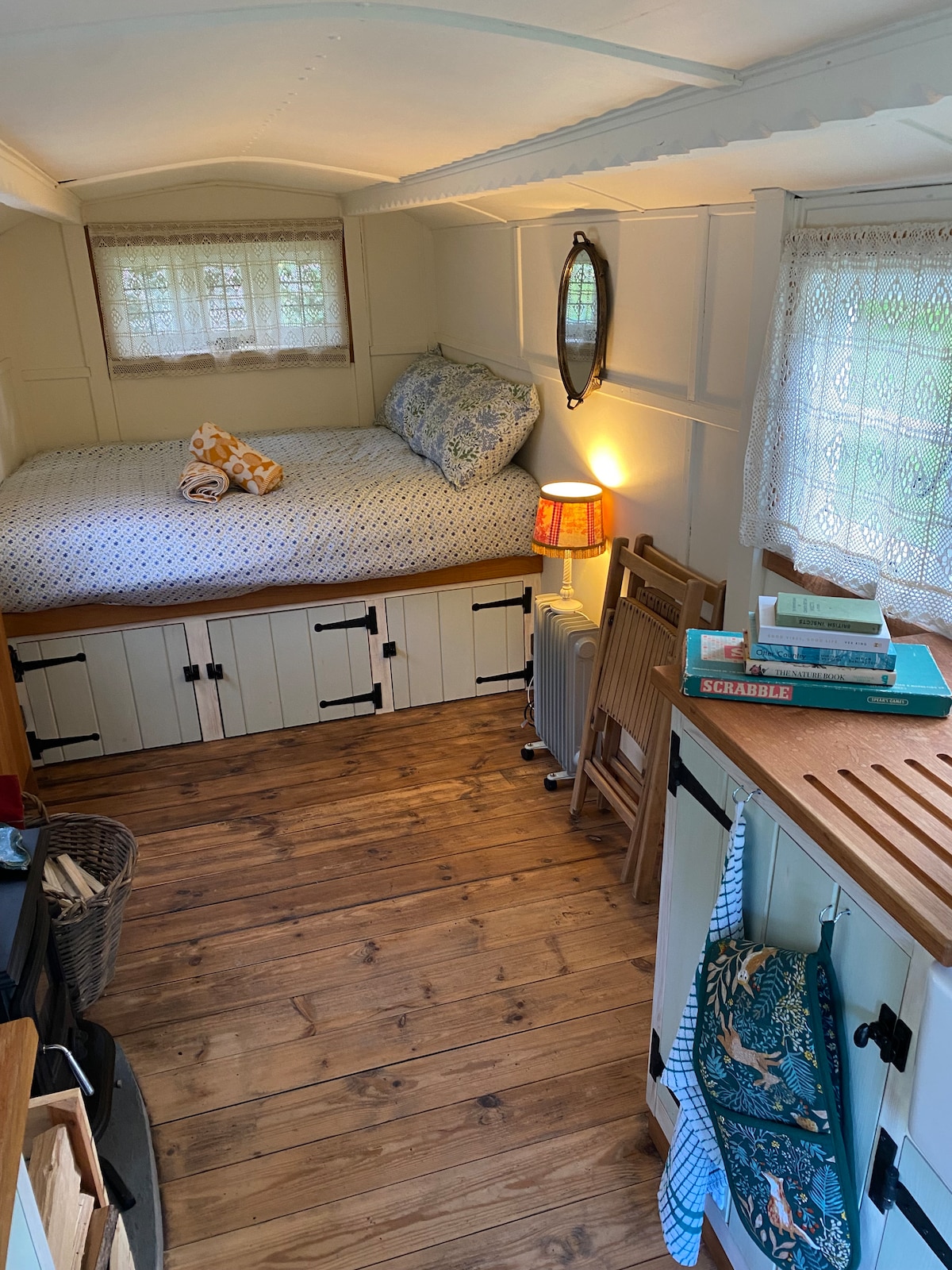 Welcome to our charming shepherd’s hut, nestled away in a private woodland. The hut is equipped with a comfortable double-bed with space for a child’s bed if required. Shower and Flush toilet are within an upcycled boat wheelhouse 30meters away. If travelling as part of a larger group, please see our other listings featuring B&B rooms available within the main house. We are located just outside the traditional market town of Mold.