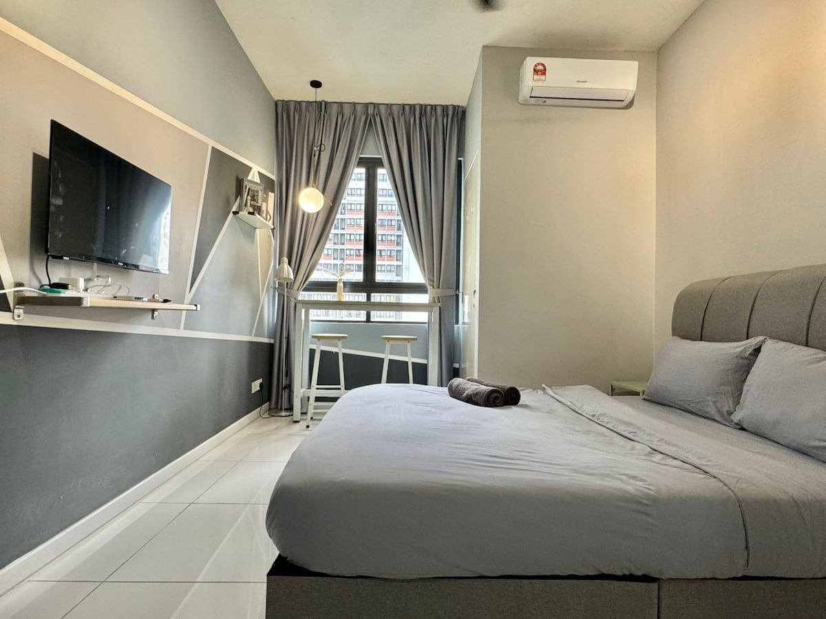 Explore our cozy studio, which can accommodate 2 to 3 people with a queen bed and a sofa bed. Only a 15-minute drive from KLIA T1/T2, the place is surrounded by many restaurants, fast food branches, groceries, and laundry shops, all within walking distance. Savor all the amenities, including the kids’ playground, BBQ area, gym, and swimming pool, with 24/7 security. * Unavailable drop your luggage before check in hours.Due to building designed, need to walk 10 steps staircase to get elevator.
