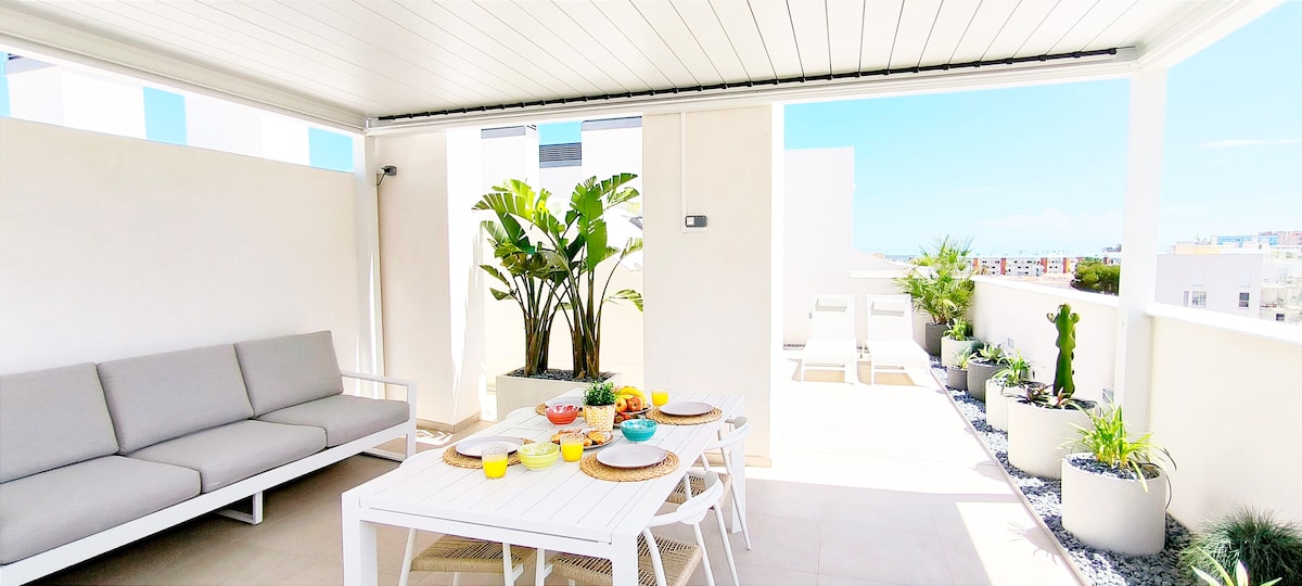 ¡Este espectacular ático es la mejor opción para tus próximas vacaciones en Dénia! Está ubicado muy cerca de la Playa de La Marineta Casiana, del Puerto Deportivo de Dénia y del centro de la ciudad. Tiene 2 habitaciones dobles, 2 baños completos, cocina y salón comedor. En la planta superior está su gran terraza con unas vistas increíbles al Montgó. Está equipada con mesa, sillas, zona chill-out, barbacoa, tumbonas y pérgola bioclimática para que puedas disfrutar de las comidas al aire libre.