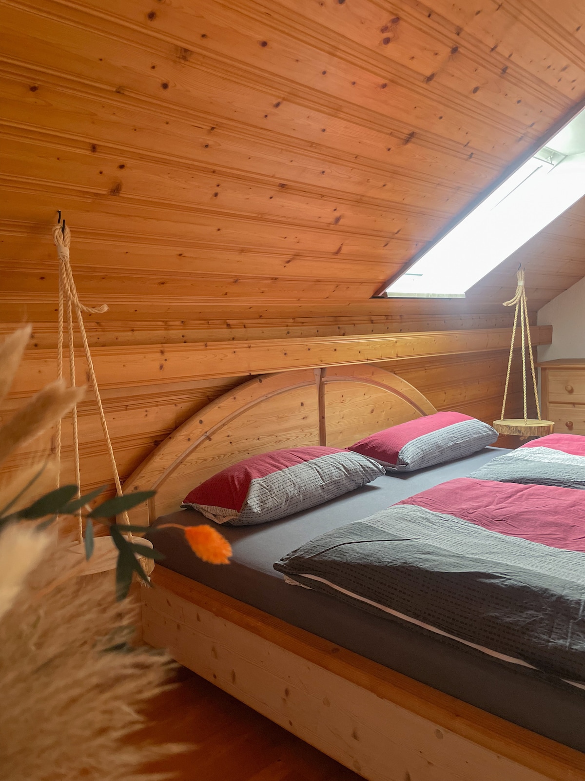 Our “Waldhütte” in the Five Lakes Region/Pfaffenwinkel is perfect for peace and nature – with great access to castles, lakes, mountains, and Munich. Secluded, 200 m from the main house, it offers pure retreat: panoramic views of meadow and forest, a terrace for dining, yoga, or knitting, stargazing from the loft. Inside, a wood stove and infrared heating keep things cozy while foxes and deer pass by outside.