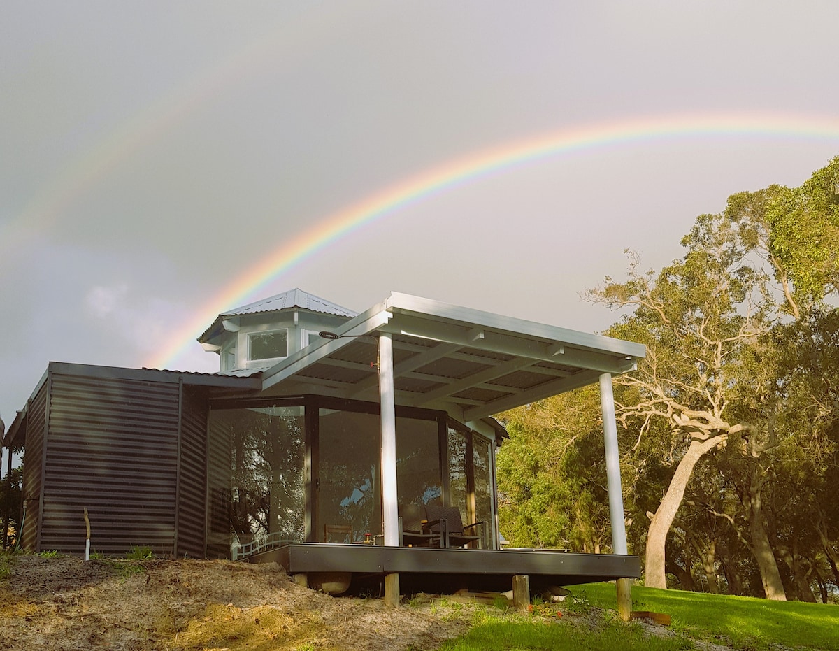 Enjoy the tranquillity of this uniquely designed octagonal chalet, set high on Weedon Hill in a natural Australian bush setting. Inlet glimpses, sounds of the ocean, sunrises, abundant birdlife and native bush vistas from every window are but a few of the wonders you will experience. With large windows throughout your experience of the outdoors is intensified in this cosy wooden cottage with woodfire for extra warmth & coziness. Only 3km from town centre, however feels like you are miles away.