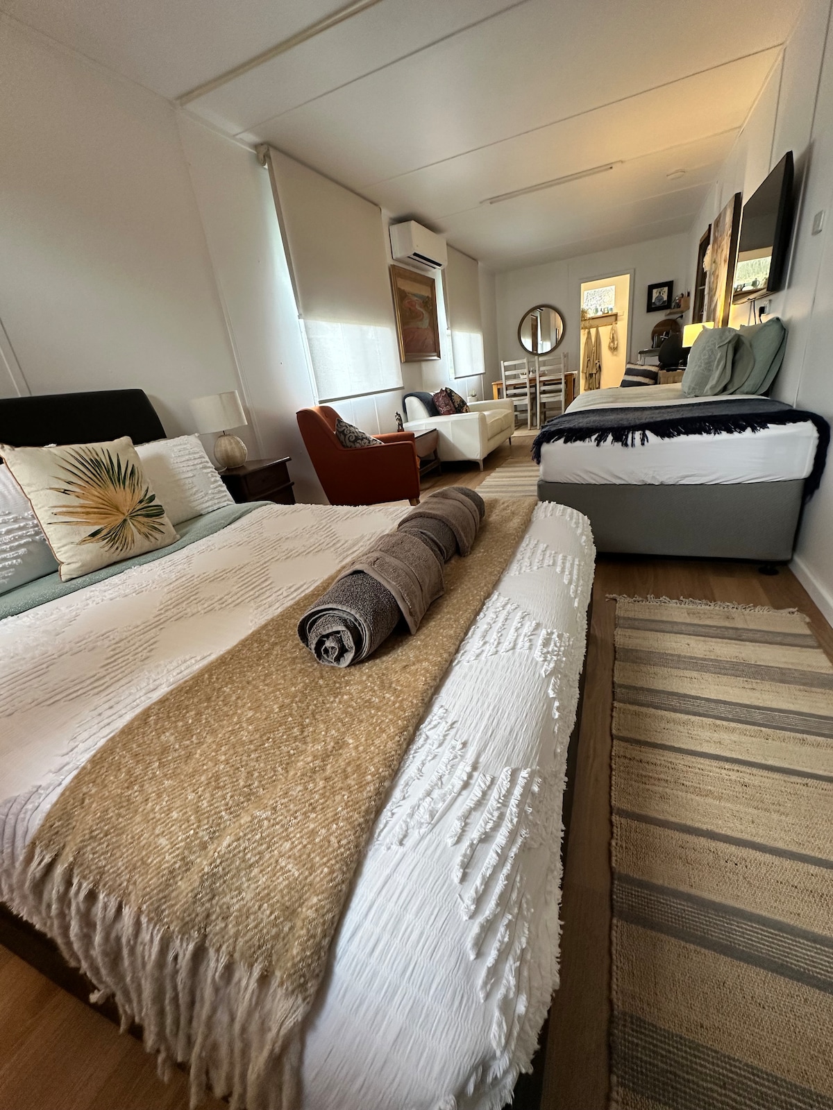 stableBASE is a sunny, architect-designed wing of our home, just a short drive from Albany’s centre, beaches, scenic walks, and National Parks. The accommodation is spacious, thoughtfully designed, with high-quality fixtures throughout, & suits up to 4 guests: • Master Bedroom: Queen bed & ensuite • Second Bedroom: Two king singles & ensuite The living area combines lounge, dining, & a fully equipped kitchen with induction cooktop, opening onto a private sunny deck.