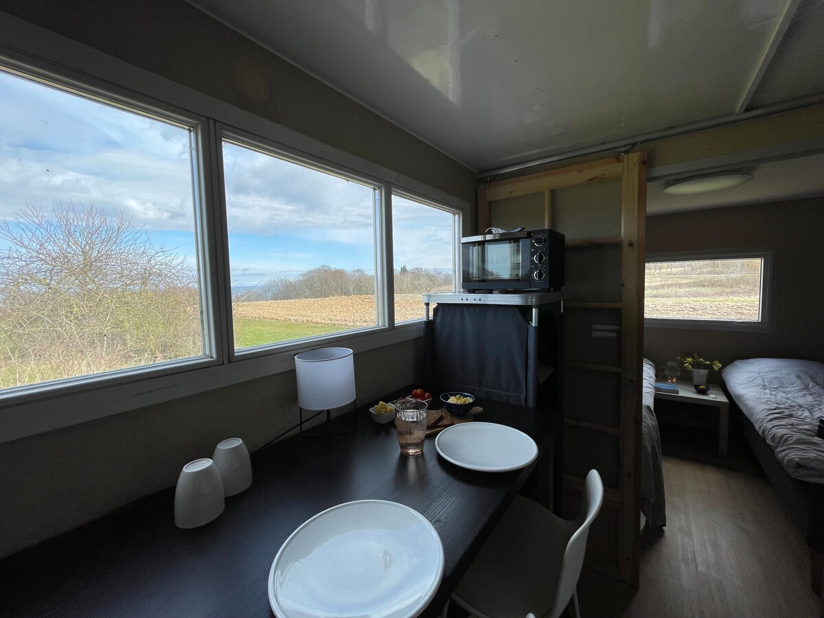 Oplev et autentisk biodynamisk landbrug og Ølene fuglereservat fra en lille, hyggelig træhytte på hjul. Inviter din partner, familie eller ven med ud i naturen og hør sanglærken synge fra din terrasse. Tilbered vores biodynamiske produkter på din gasgril, og snup noget koldt at drikke fra dit køleskab. Besøg fugletårne til fods få kilometer fra vognen. Slut dagen af i godt selskab under stjernerne. Vi glæder os til at tage imod jer :)