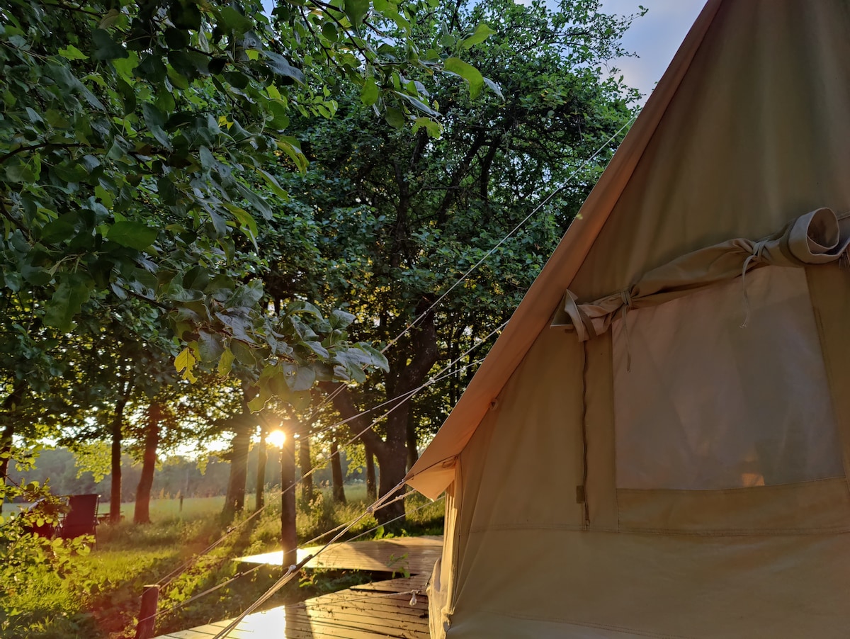 Her kommer du tæt på naturen. Nyd udsigten fra dette 28 m2 luksus-glampingtelt, med en stor opredt seng, dyner fra Fossflakes, træterrasse, eget das midt i skoven, udebrus og en fuldkommen unik, fredfyldt stemning. Teltet ligger i privat skov, så du er uforstyrret. Om aftenen kan du tænde lanternerne eller tage et stjernekig gennem den gennemsigtige top i teltet. Du kan lave mad på en gasgrill eller trangia. Der er gryde/pande/kaffebrygger til rådighed.