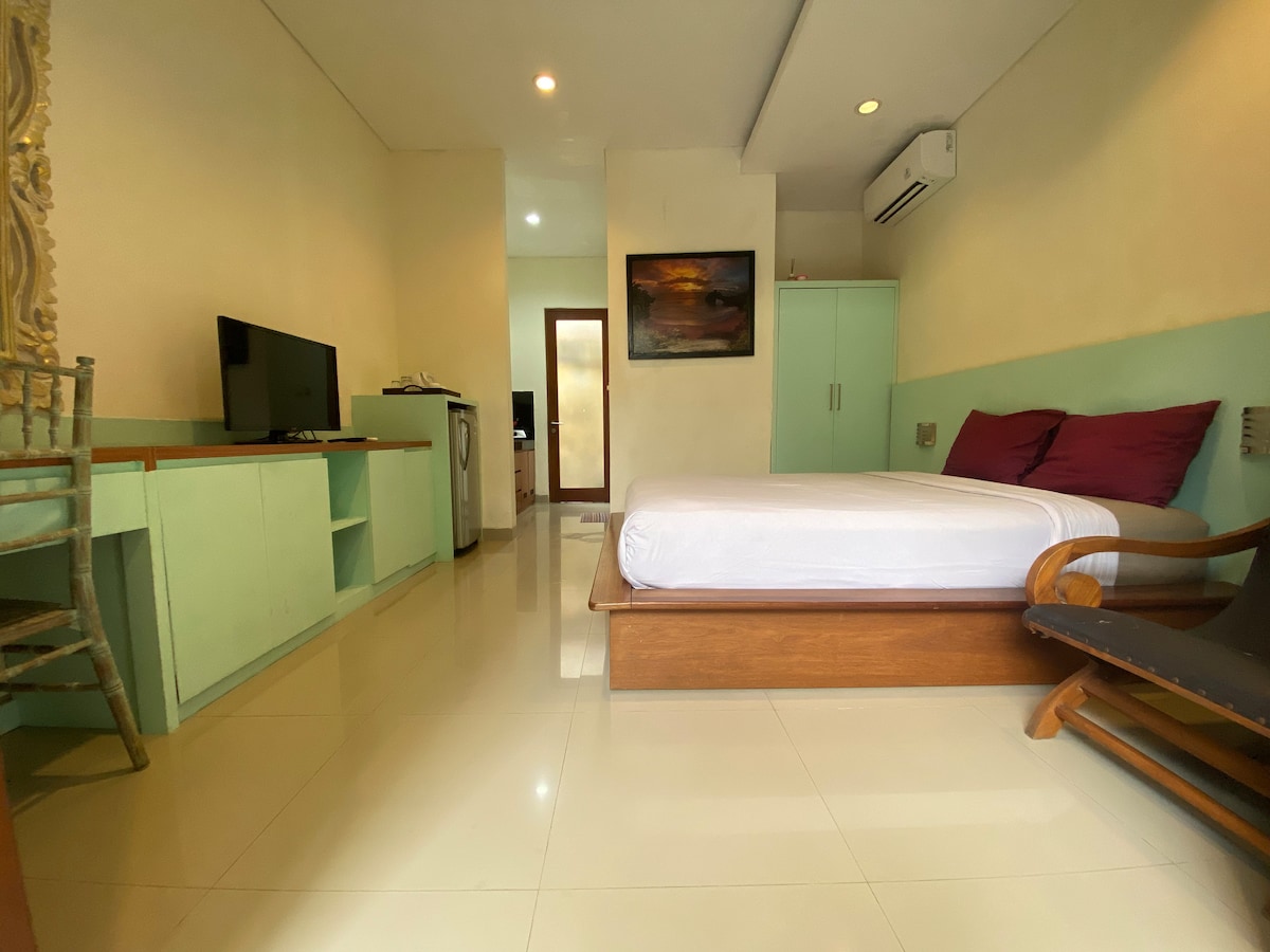 Welcome to our peaceful and centrally located studio apartment in beautiful Bali! Nestled in a serene neighborhood, while being conveniently close to supermarkets and other shops, ensuring that all your needs are within easy reach. A short drive will take you to stunning beaches like Kuta, Seminyak or Canggu, where you can soak up the sun and surf. The apartment features a comfortable queen-size bed.Fully equipped private kitchenette allows you to prepare your own meals whenever you desire.