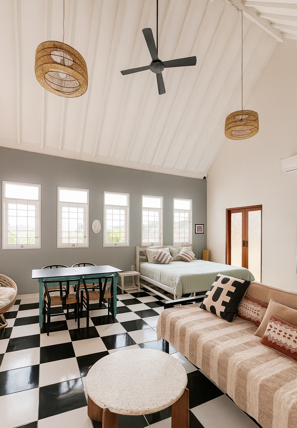 Rasakan perpaduan sempurna antara gaya dan kenyamanan di mezzanine loft bertema industri yang dirancang sebagai apartemen compact, terletak dekat dari Pantai Sanur dan pusat kota. Cocok untuk pasangan, pelancong solo & digital nomad. TV pintar 50 inci, Fast WIFI sampai 400mbps & tempat tidur sofa yg nyaman di ruang TV. Dapur lengkap & teras belakang pribadi. 7 menit ke Pantai Sanur 7 menit ke Grand Lucky/Pepito supermarket 7 menit ke Rumah Sakit Internasional Bali 40 menit ke Bandara Ngurah Rai