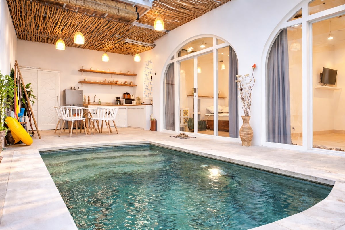 Maison Boheme Villa 1 — Sanur (1BR) Chic boho hideaway in the heart of Sanur: • 1 stylish air-conditioned bedroom • 1 modern bathroom with amenities • Bright lounge + dining nook with unique design details • Kitchenette for simple meals & snacks • Garden feel with a fully fenced private patio • Pool access for refreshing dips • Ideal for solo travelers or couples looking for a cozy base in Sanur