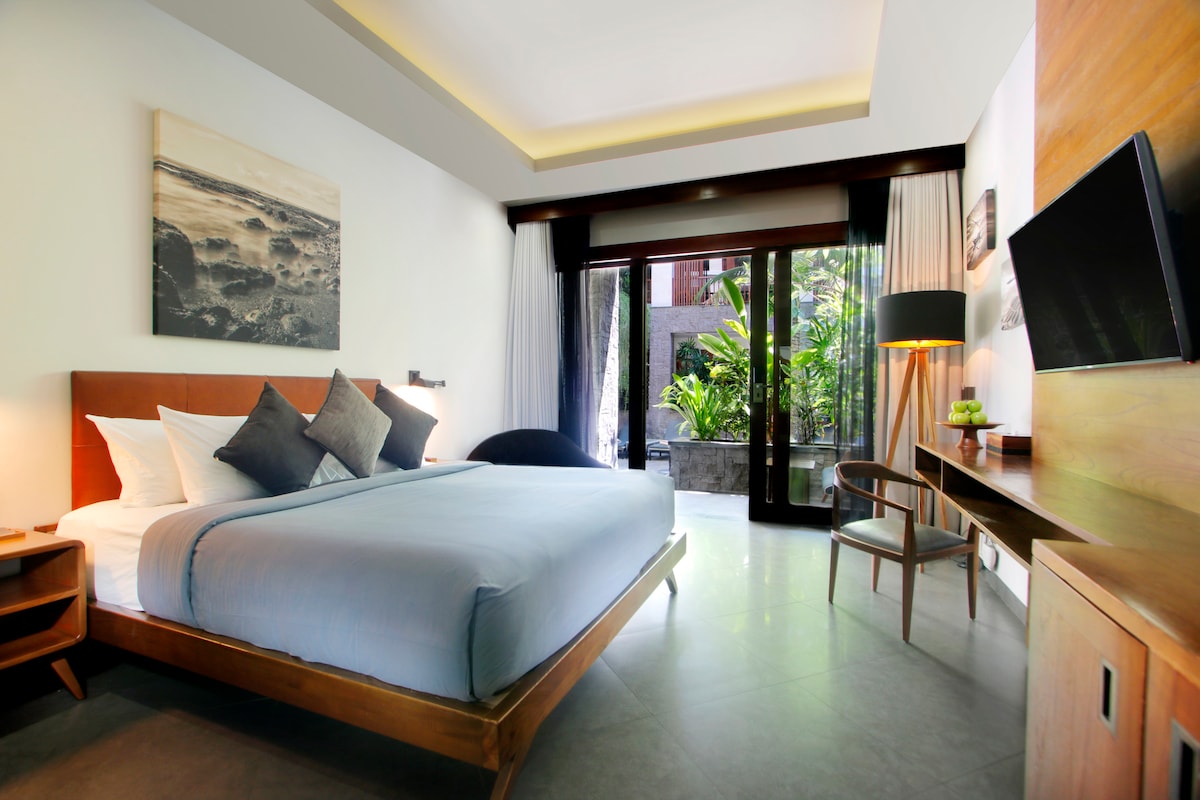 Positioned on the upper levels of the hotel, the Jungle Room with Pool View category benefits from a private balcony that catches the Sanur sea breeze.