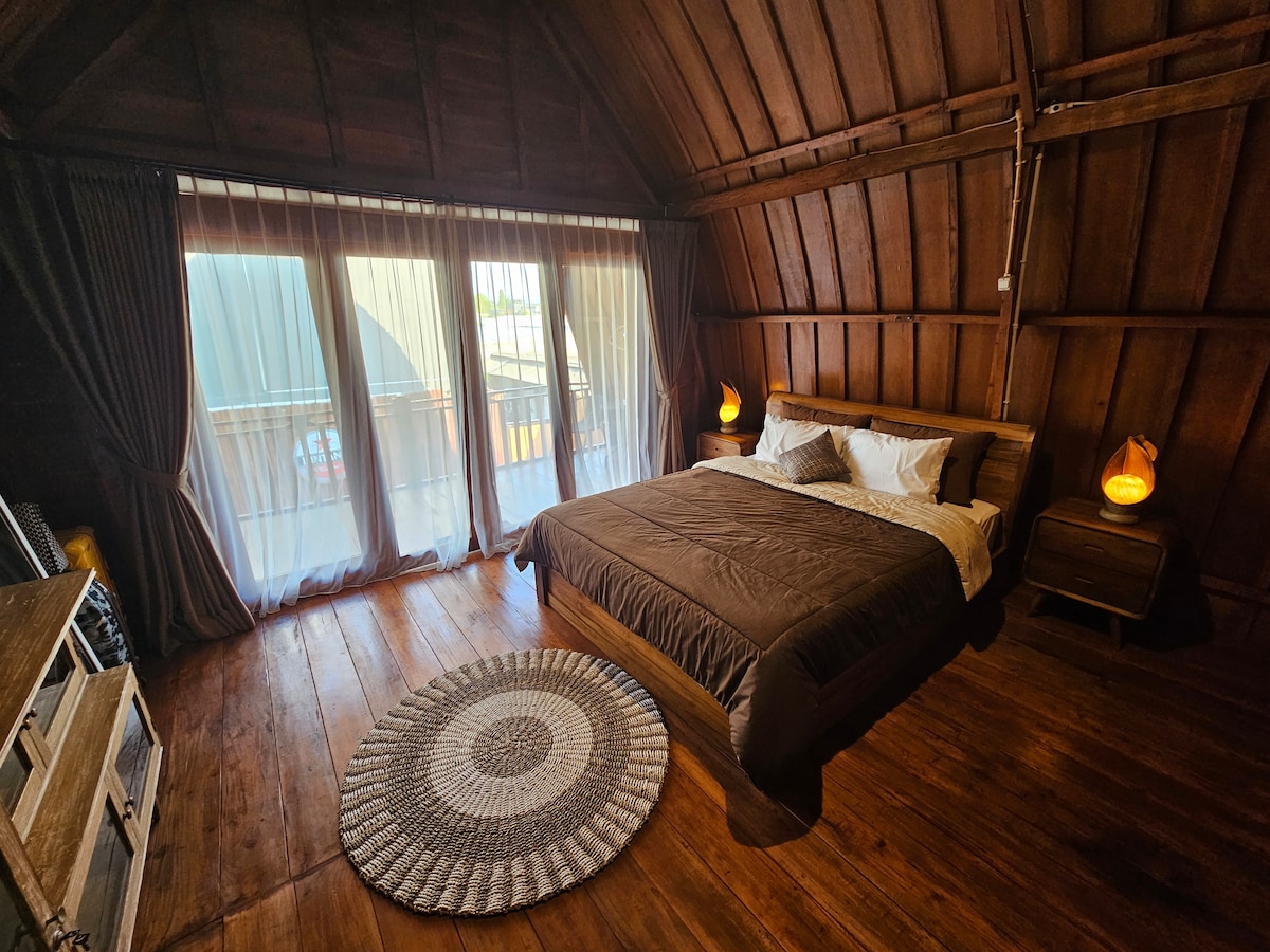 With its floor to ceiling windows, you get panoramic views of Bali's tropical landscape. Take a moment and sit outside your private terrace overlooking a secluded river and pool. The pool is shared with other rooms. Have a seat in the walk-in shower and let the running water cool you off after a long day exploring Bali. This room comes included with an HDMI cable so you can connect to the flat screen TV. Our signature amenities come included in all of The Paica rooms.