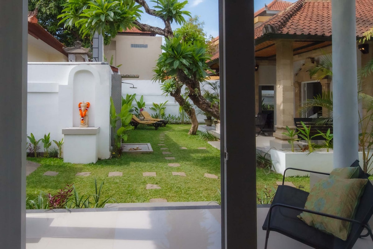 Two-bedroom house for up to 4 adults or 2 adults + 3 children. The AC master bedroom has an en-suite bathroom, while the cosy attic has twin beds. Master bedroom opens to spacious living room. Breakfast is available for an additional price. There is a large shared garden, kitchen, dining area, pool (w poolside toilets & shower), parking and access to Sanur beach. Breakfast options available. WiFi 50 Mbps indihome (Telkom's fiber-optic network).