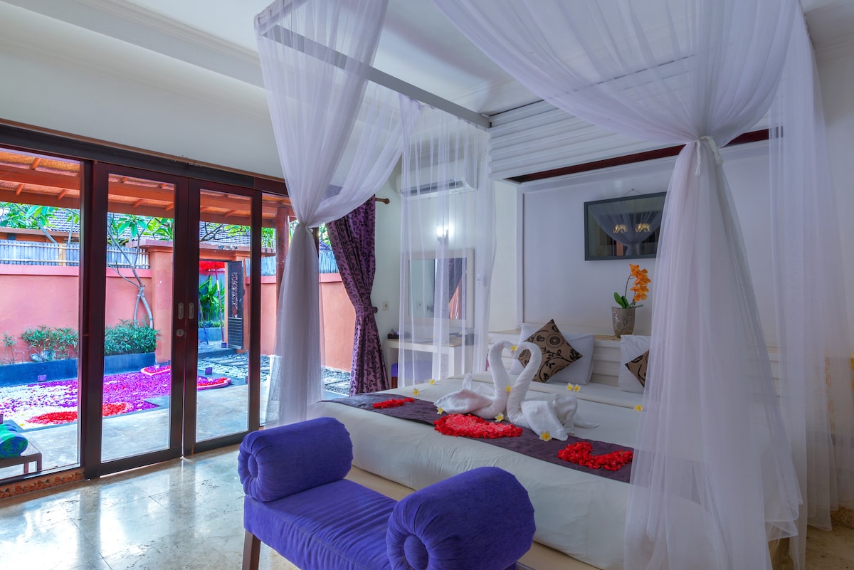 The property is the exclusive resort provides seclusion with the convenience of being a short distance by our shuttle service from the lovely Kuta with its white sandy beach, restaurants and shops and 5-minute walk to Mall Bali Galeria shopping center. The property offers a spacious private pool villa with Balinese well-screened & separated from the nearby main building for excellent privacy.