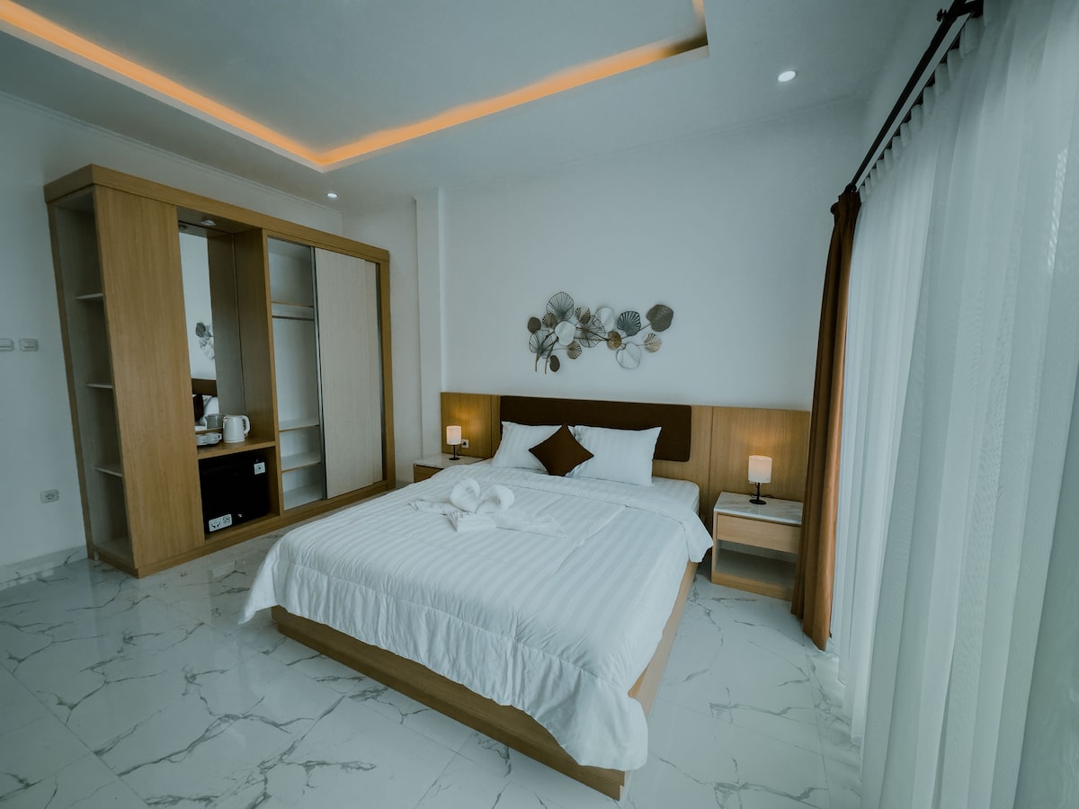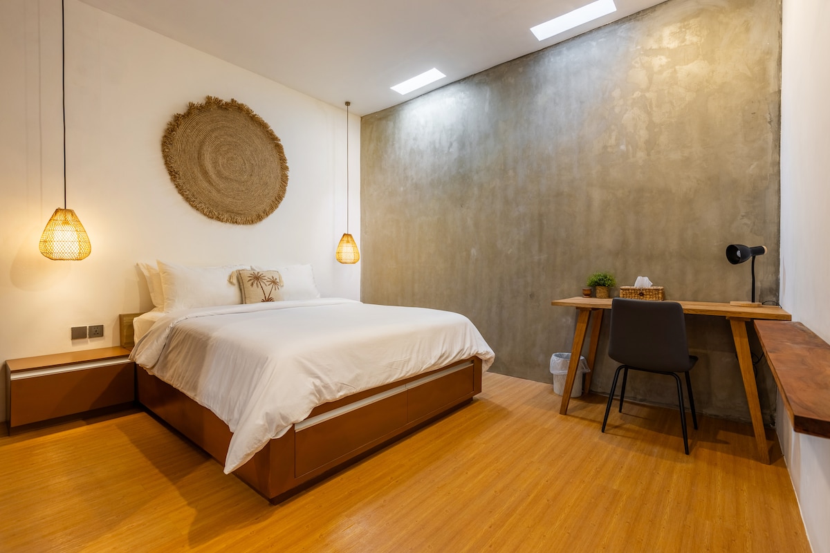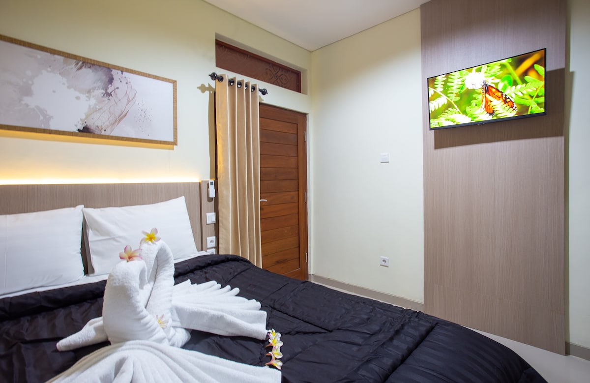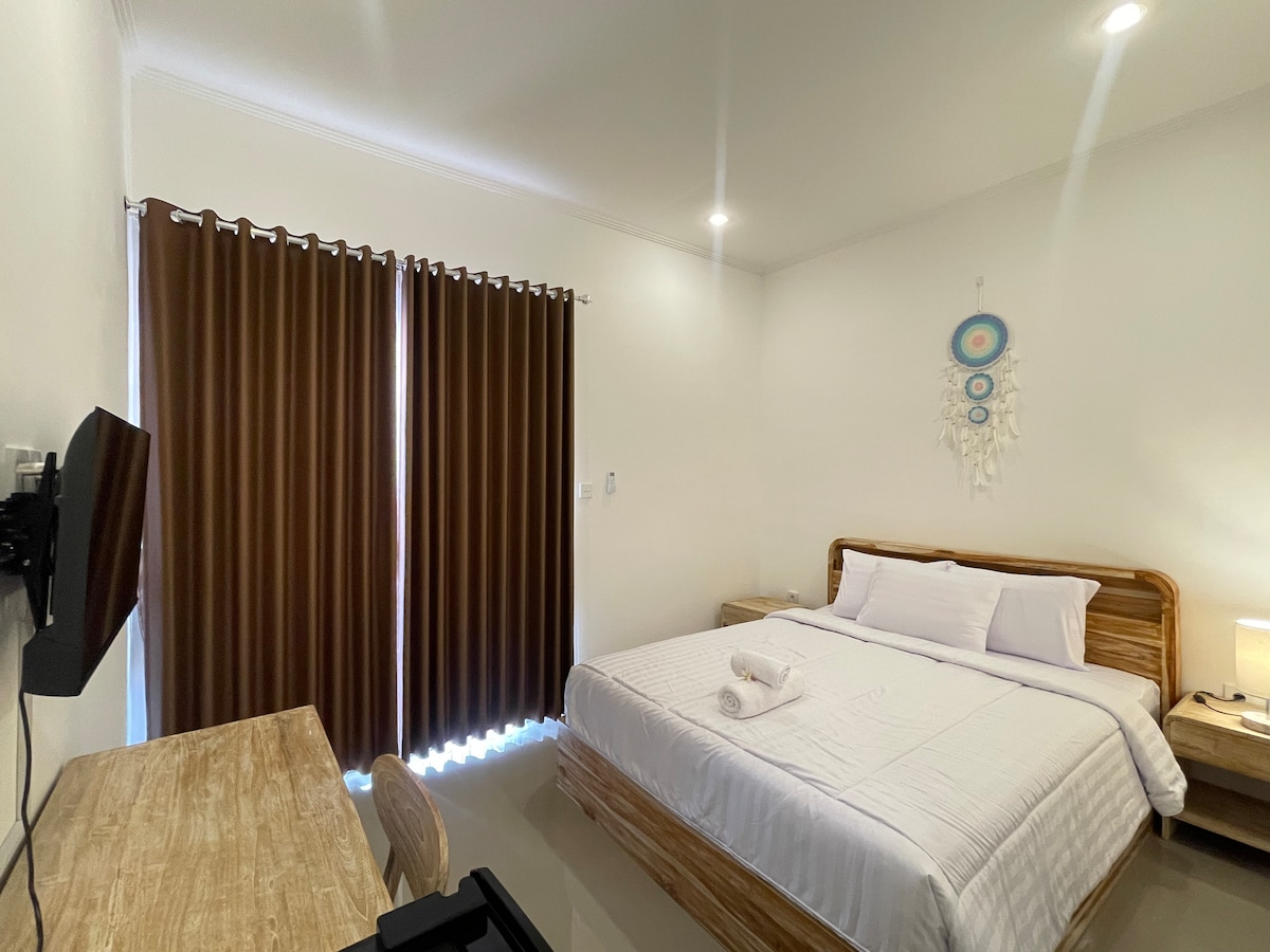 A Comfortable & serviced boarding house near Canggu & Kuta. 15sqm Studio Room w/ an en suite bathroom & complete facilities such as Hot Water, Shower, as well as a fully equipped private kitchen with cooking utensils so you can cook your favorite food easily. A bedroom equipped with a 140x200 cm bed, AC, desk, wardrobe, 32" Android TV, Refrigerator, & Hi-Speed WIFI. Easy to access various important & amusement places