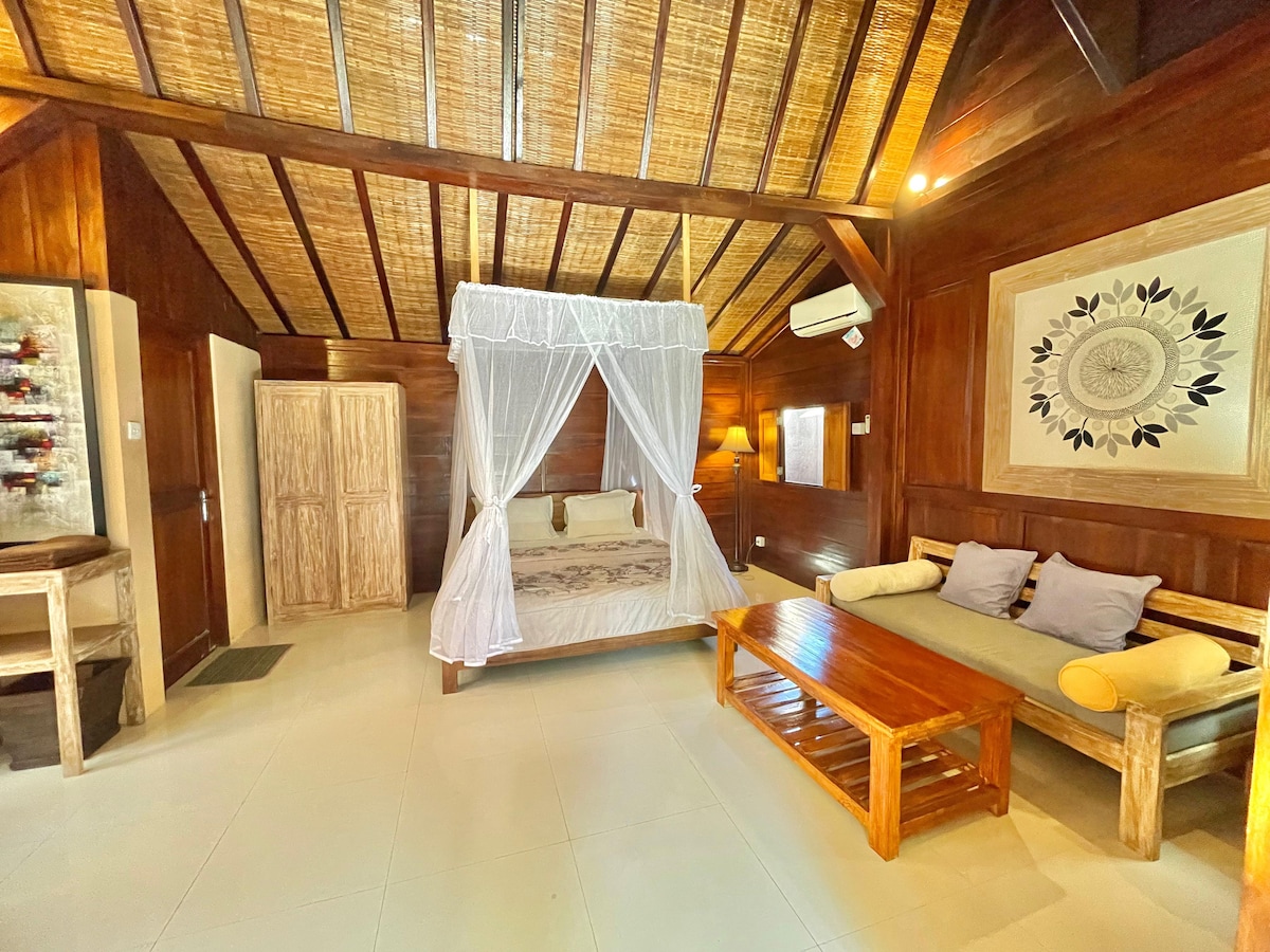 Kamar pribadi yang nyaman dan lapang yang memiliki design unik semi-modern dengan berbagai fasilitas lengkap didalamnya seperti Dapur pribadi, meja makan yang dipadukan dengan sedikit ruang terbuka , toilet (indoor)yang terpisah dengan bathub (outdoor) serta Kursi sofa untuk bersantai. Kamar ini terletak dalam satu area penginapan dengan 5 bangunan lain sekitarnya dimana memiliki pool, lobby, laundry dan komunal area yang digunakan bersama.