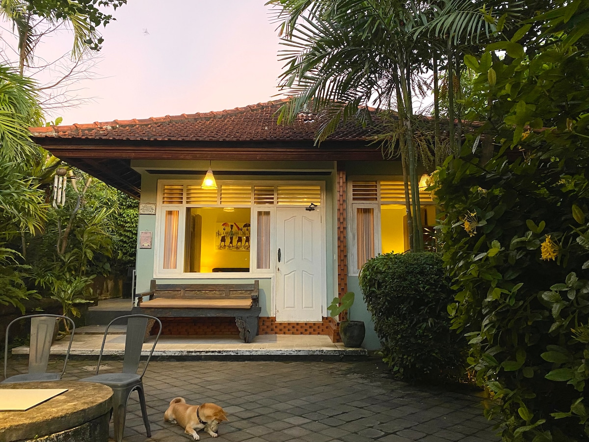 A tropical retreat in central Sanur, with Bali and Java-style homes, set amidst a luscious, green garden. WiFi access, free parking space. Quiet and hidden from the hustle and bustle of life on the streets and a walking distance to the beach (1km) and countless restaurants, shops, and spas. Very natural ambient with lush garden plants and flowering frangipanis, reflecting Balinese tropical beauty and style. Each house can accommodate up to 3 people. Minimum stay 4 days.