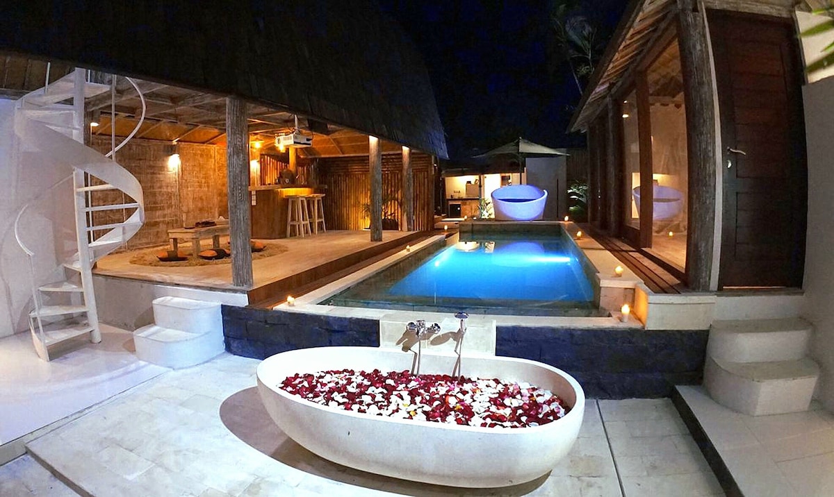 A stunning private villa in a newly built small villa complex. Book this villa alone or combine with the other villas for larger groups, big family or group of friends. Apartment: cap. 2 pax (1 BR, No Pool) THIS VILLA: cap. 2 pax (1 BR, closed living w AC) Villa 2: cap. 2 pax (1 BR, closed living w AC) Villa 3: cap. 4 pax (2 BR, open living) Villa 4: cap. 8 pax (4 BR, closed living w AC) • Daily cleaning • Private Pool • Bathtub • Smart TV • Private parking • AC in rooms :-) • Kitchen • CCTV