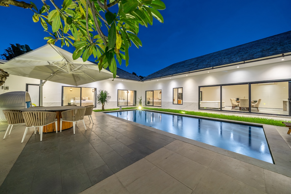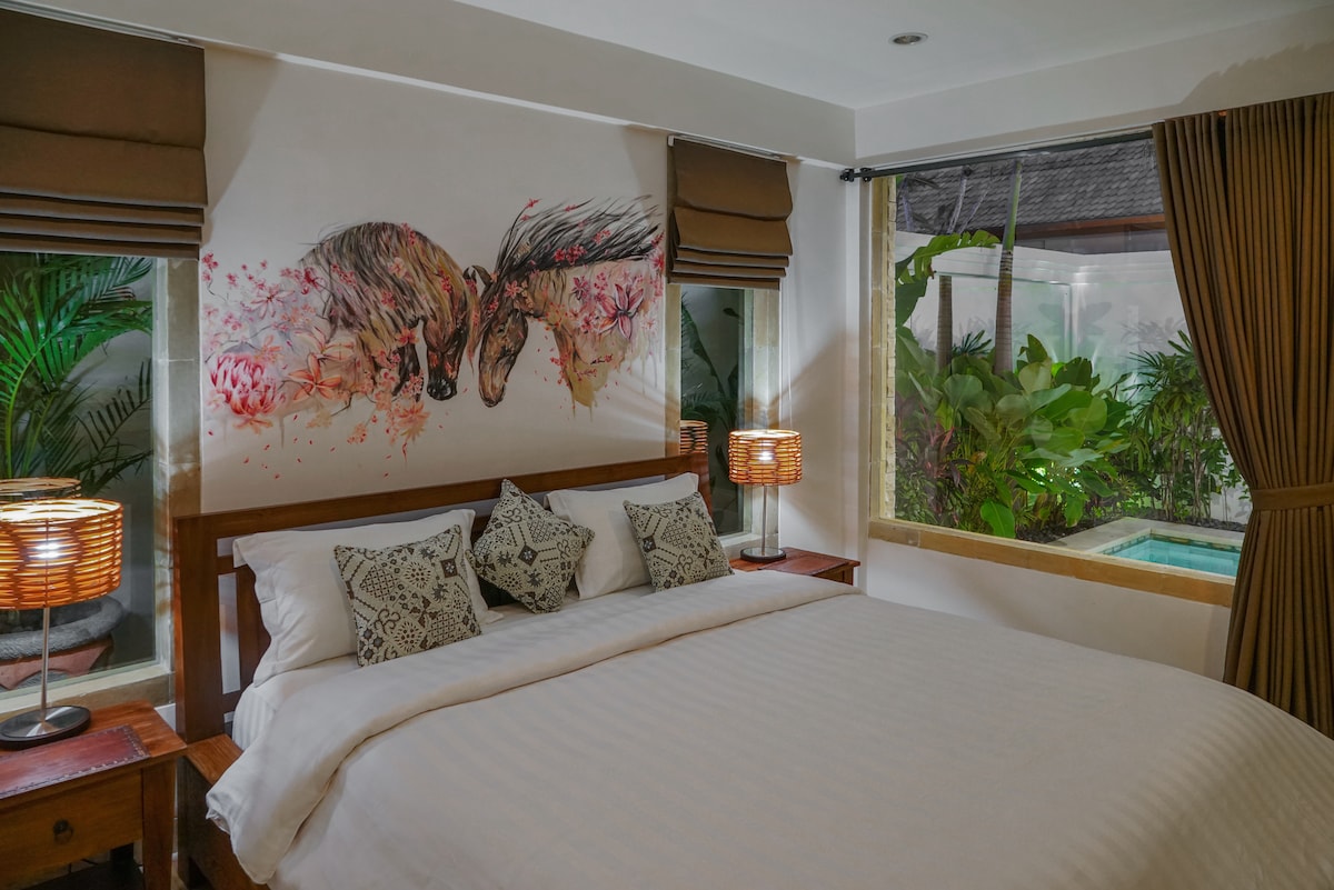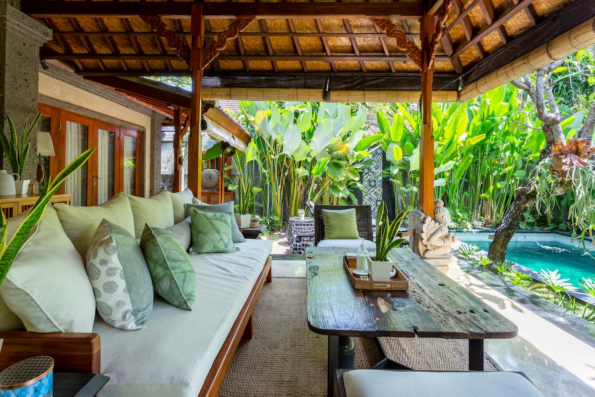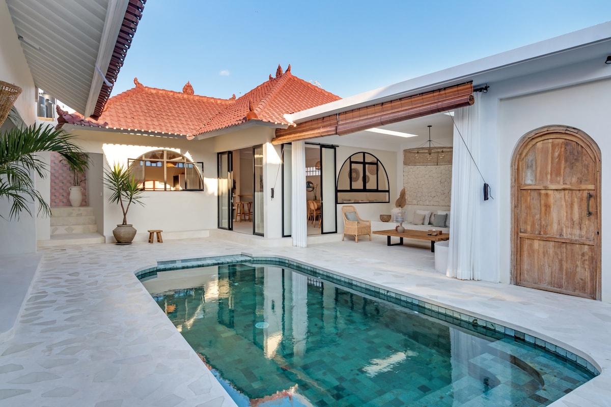 A stunning private villa in a newly built small villa complex. Book this villa alone or combine with the other villas for larger groups, big family or group of friends. Apartment: cap. 2 pax (1 BR, No Pool) THIS VILLA: cap. 2 pax (1 BR, closed living w AC) Villa 2: cap. 2 pax (1 BR, closed living w AC) Villa 3: cap. 4 pax (2 BR, open living) Villa 4: cap. 8 pax (4 BR, closed living w AC) • Daily cleaning • Private Pool • Bathtub • Smart TV • Private parking • AC in rooms :-) • Kitchen • CCTV