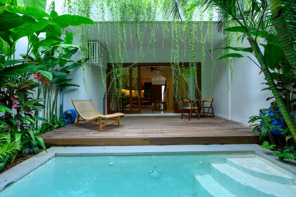 Modern 2BR townhouse in Sanur, 15 min walk to the beach. 110 sqm over 2 floors with private 8 sqm pool and terrace. Both bedrooms with king beds and AC, one with work desk. Enclosed living room, Smart TV (Netflix, Apple TV), fast WiFi. Fully equipped kitchen, washing machine, water dispenser and safe. Housekeeping 3x/week. Quiet area, parking for bikes. Ideal for families and long stays.